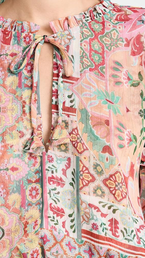 V neckline with tie closure, Long sleeves with elastic cuffs, Tiered seams and ruffle edges, Metallic threading