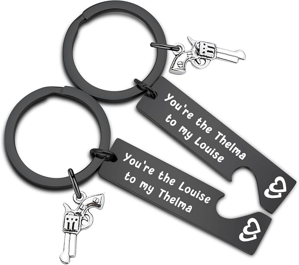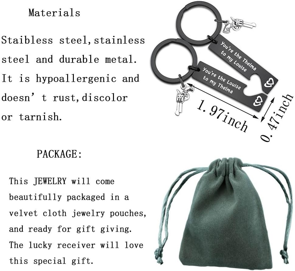 Engraved on the key chain:“you're the Thelma to my Louise/you're the Louise to my Thelma”perfect for long distant relationship friendship,a great gift, to show your partner you sister.Best Friends Key chain Set,This key chain set is very meaningful to each other.
