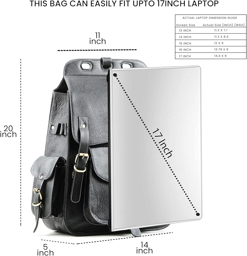 SIZE & MATERIALS: This Backpack is made of high-quality Full Grain Soft Buffalo leather, lined with black Nylon mix Fabric, and has Push Clip for easy open and close. This Large bag measures 51x35x12cm (20 x 14 x 5 inches - H x L x W ) ( Length at top is 11 inches ) and weighs 1.9 kg/4lbs with an interior volume of 23L – suitable as hand luggage for most airlines, it can also hold a pair of cloths along with other essentials. NOTE: WILL BE VERY LARGE FOR PERSON HEIGHT BELOW 5'8.00" (172 cm)