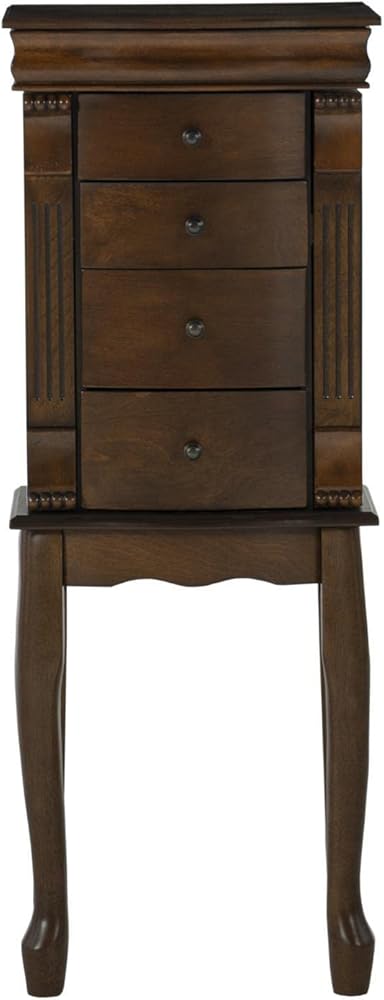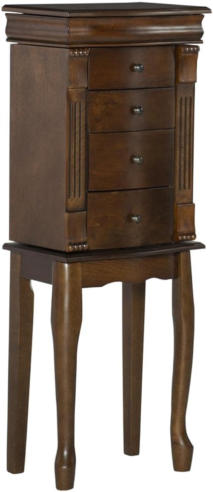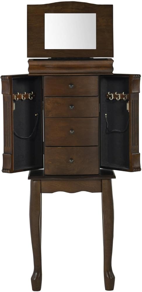The freestanding "Walnut" finished jewelry armoire is accented with beautiful round drawer pulls, intricate carved details and Queen Anne Legs. Sized for economy and function, this jewelry armoire is the perfect piece to store all of your beloved treasures. Inside features plush black lining. Some assembly required.