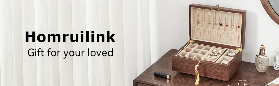 Do you own a jewelry box made of natural solid wood? —— Homruilink Jewelry Box is made from 100% natural North American walnut, velvet and solid brass handles combined with 12 years of wood processing to provide premium protection against scratches and stains on your valuables.