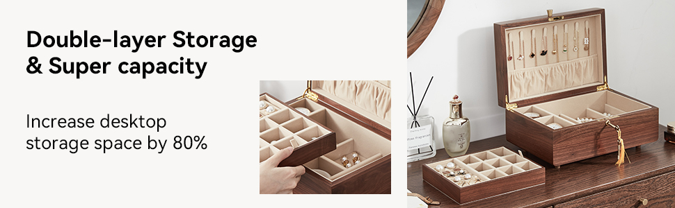 Have you ever lost jewelry? —— This women's jewelry box would be an excellent gift for yourself. The unique design of Homruilink jewelry box not only enhances your storage space, but also the rustic quality of walnut wood to complement your unique taste.