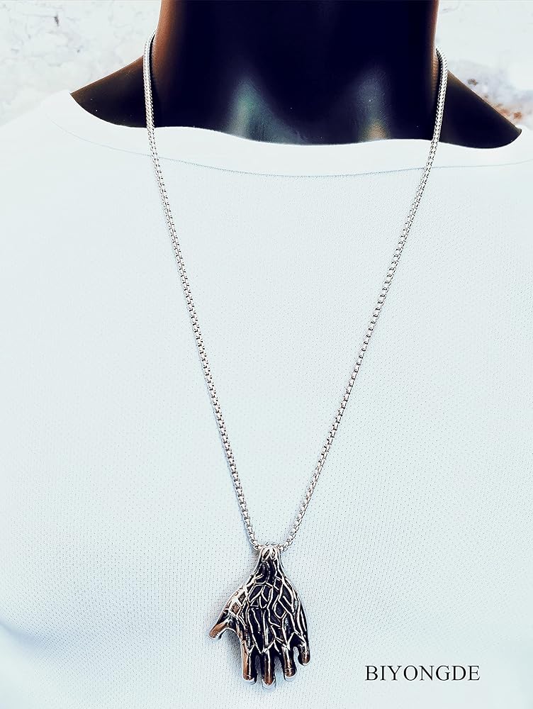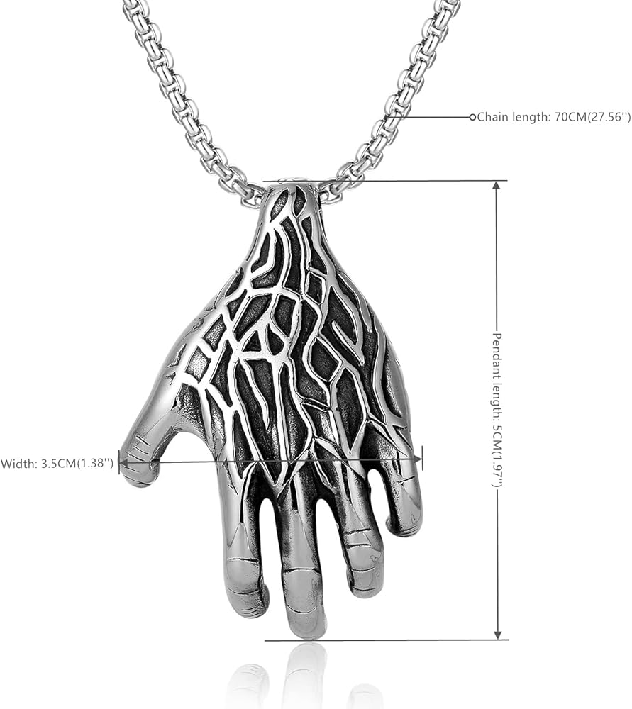 Vintage Hand Skeleton Pendant, 28 inches Chain Necklace, Stainless Steel Mens Womens, Gothic Rock
