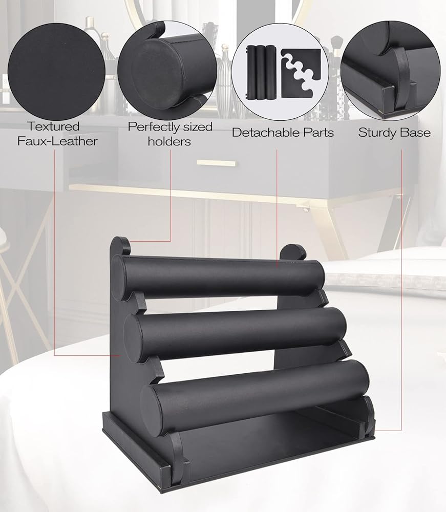 [DESIGN] Exquisite appearance and durable design. A stylish addition to any vanity. Featuring one tier with removable bars to hold and display your jewelry collection, keeping your dresser clutter-free. T-Bar design of our jewelry stand keeps all of your jewelry in sight and easily accessable, which is sure to help you organize your jewelry collection without taking up much space.