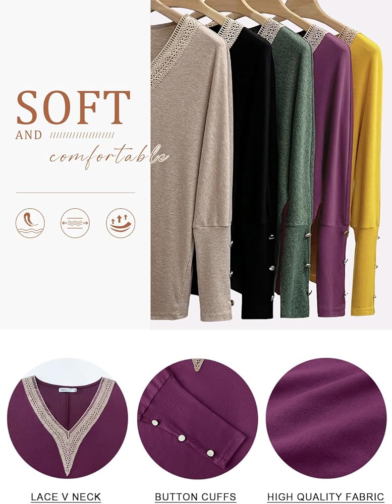 Features: batwing sleeve design and oversized style, delicate crochet lace v-neck trim, unique silver buttons on the sleeves, regular fit and solid colors ,which makes you look more intellectual and elegant.