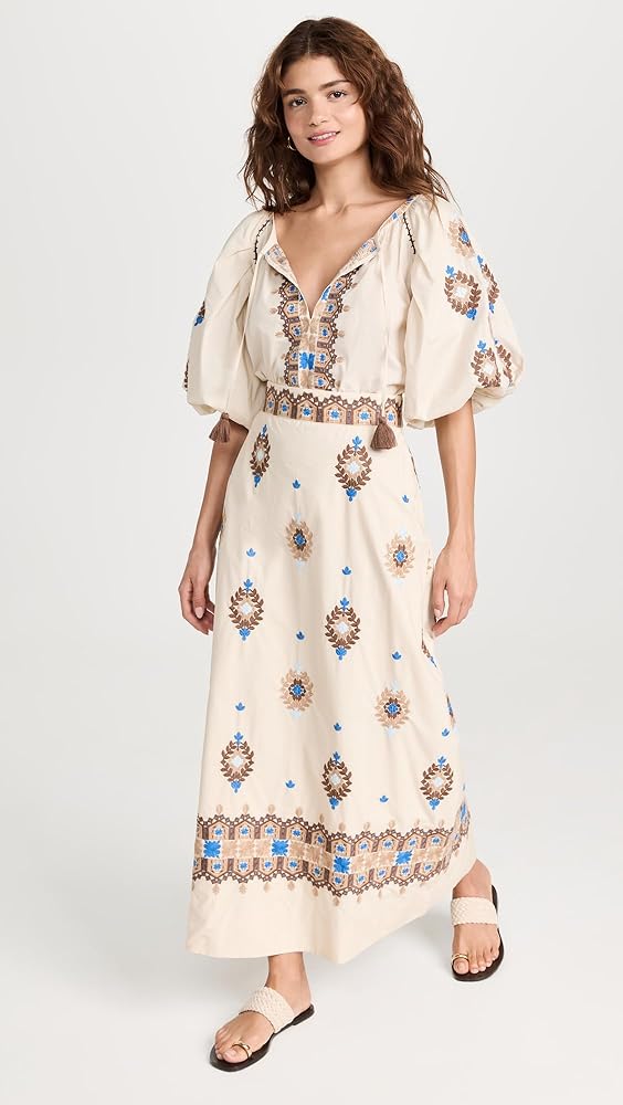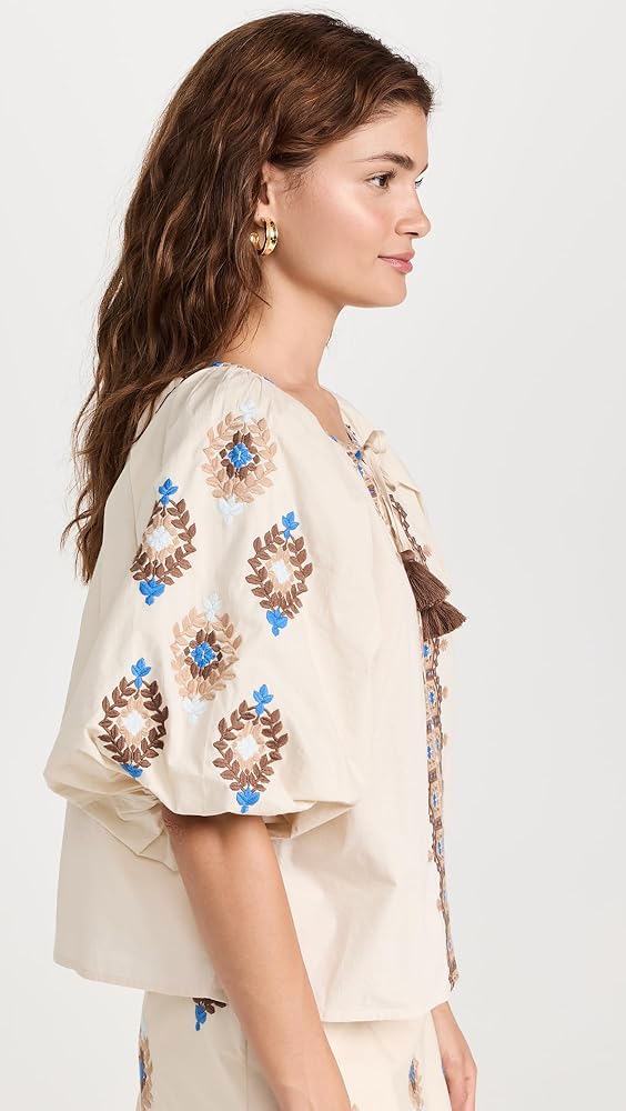 - Open V neckline with tassel tie closure, Geometric embroidery