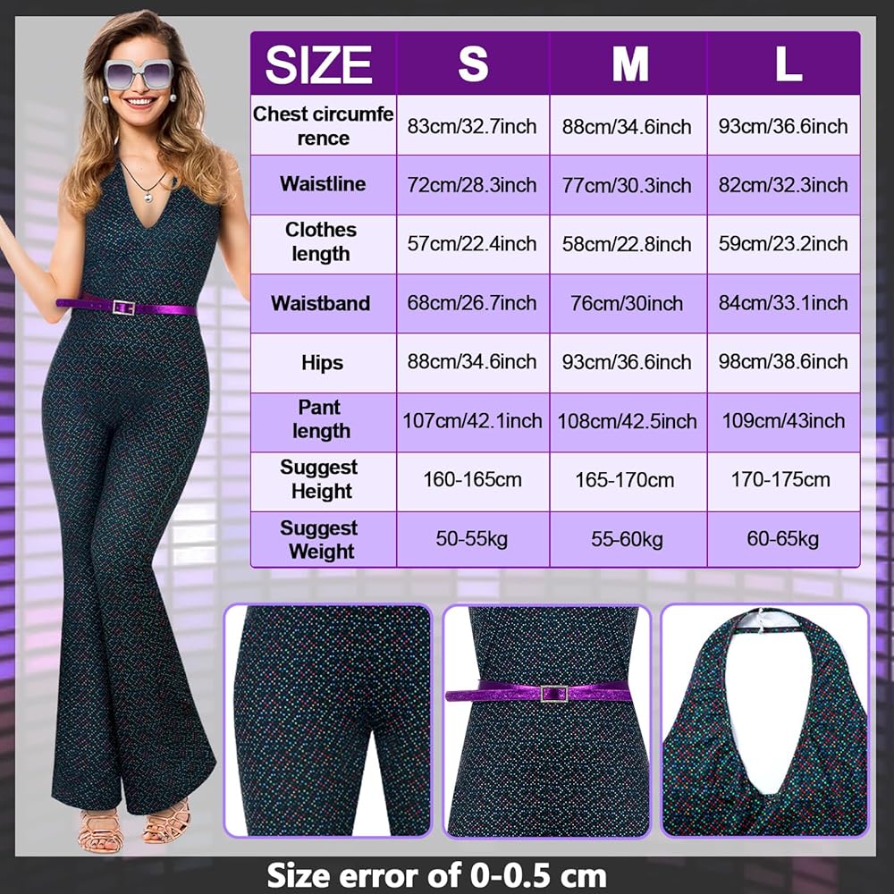 The disco jumpsuit has dazzling patterns, and this slim fit jumpsuit is easy to show your curves, wearing it will make you stand out in the crowds, with bright purple belt, this bright purple belt is not only for costumes, but also can be applied to add charm in daily life.