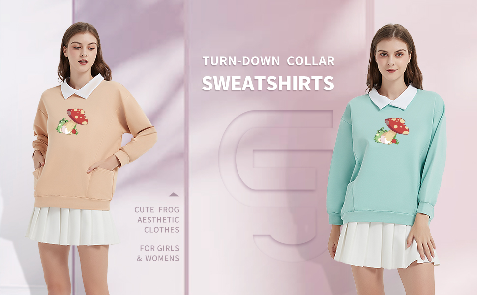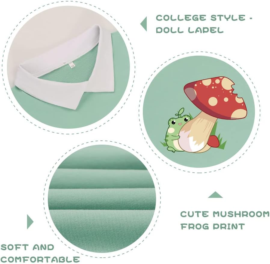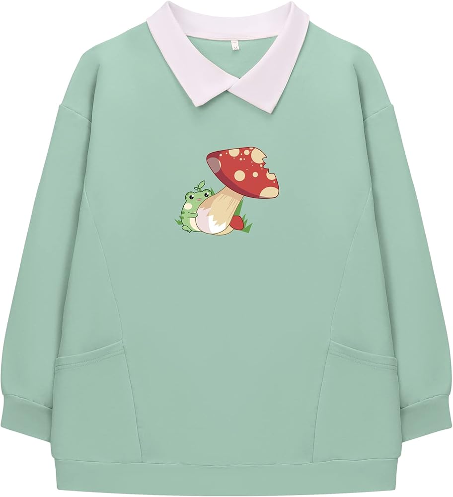 ✿ Design Features: Original design with cute frog and mushroom pattern, long-sleeved, two side pockets, and preppy white lapel design for a stylish aesthetic. Women's casual frog pullover tops, womens frog hoodie, girls kawaii sweatshirt