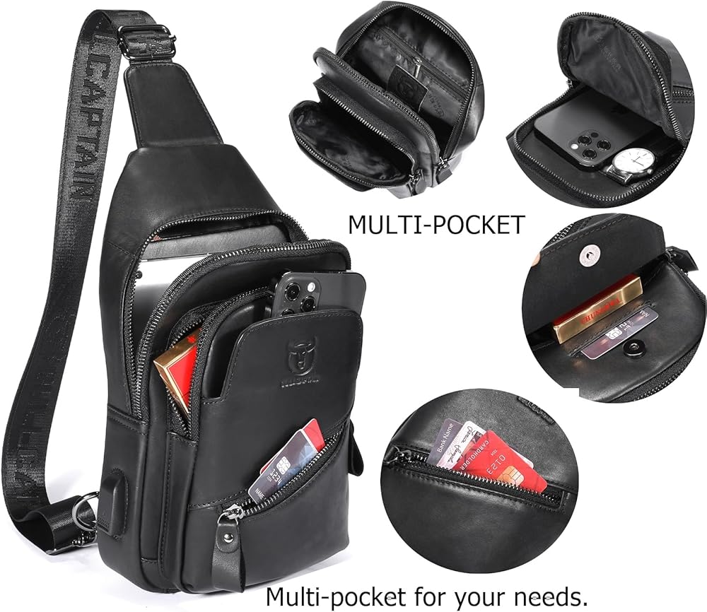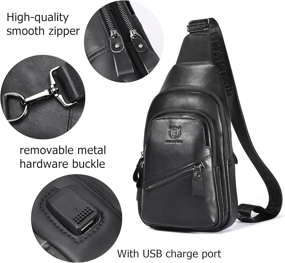 BULLCAPTAIN Genuine Leather Sling Chest Bag Multi-pockets Hiking Travel Casual Crossbody Backpack