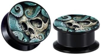 Pair of Skull & Octopus Tentacles Acrylic Screw-On Ear Plugs. High Quality, Durable! 8 Sizes to Choose from!