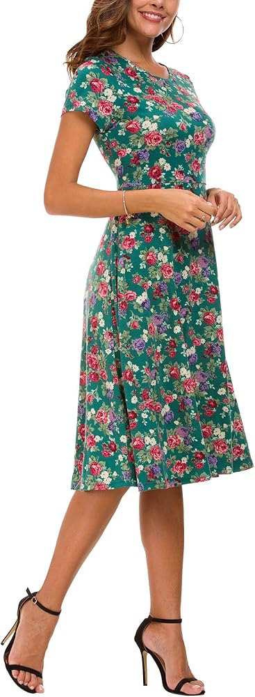 - Features short sleeve,round neck,flare skirt bottom and floral print