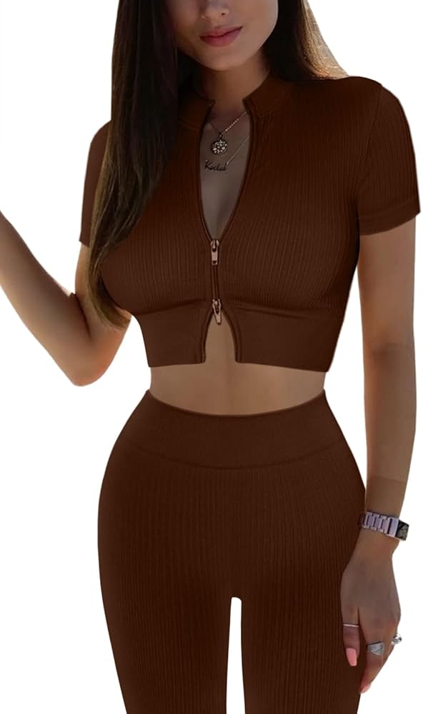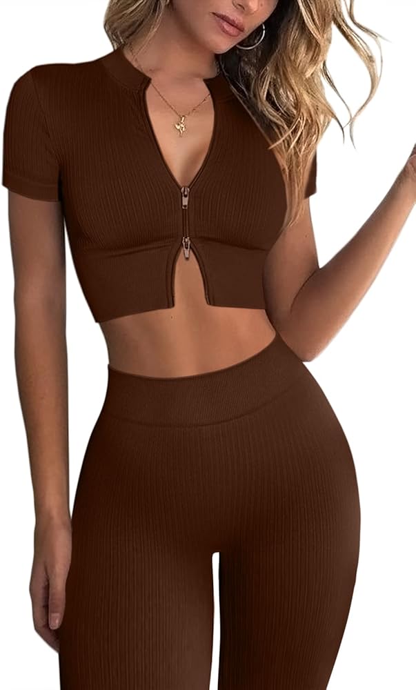 Mulisky Women's 2 Piece Workout Sets for Women Zipper Ribbed Crop Top Seamless High Waist Leggings Gym Yoga Outfits