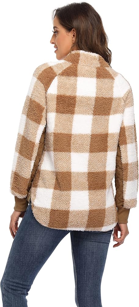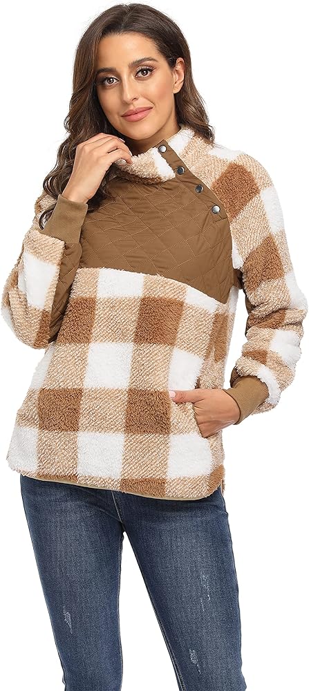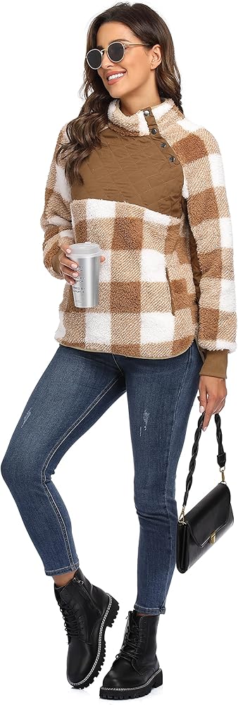 Style: cute and stylish. a solid block combination brings a cute look to this fleece sherpa pullover. side snaps and geometric stitching make it stylish. button the snaps to keep you warm, unbutton the snags to make it loose or cool.