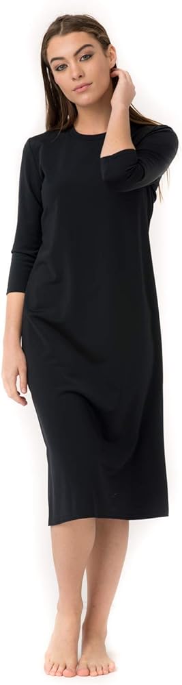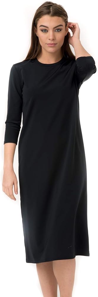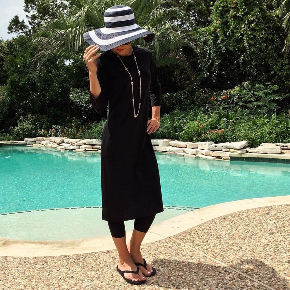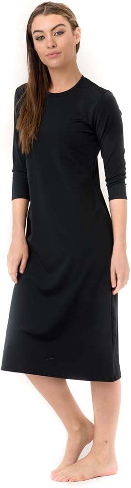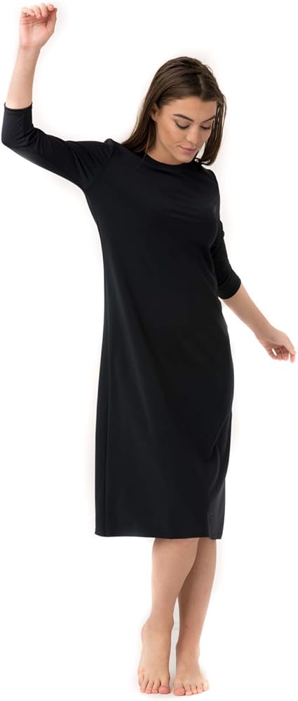 Not only is this an AMAZING swim dress but this can be used anywhere from a YOGA class to an ATHLETIC dress. The knee length swim dress hits about 2 inches below the knee and has 3/4 length sleeves