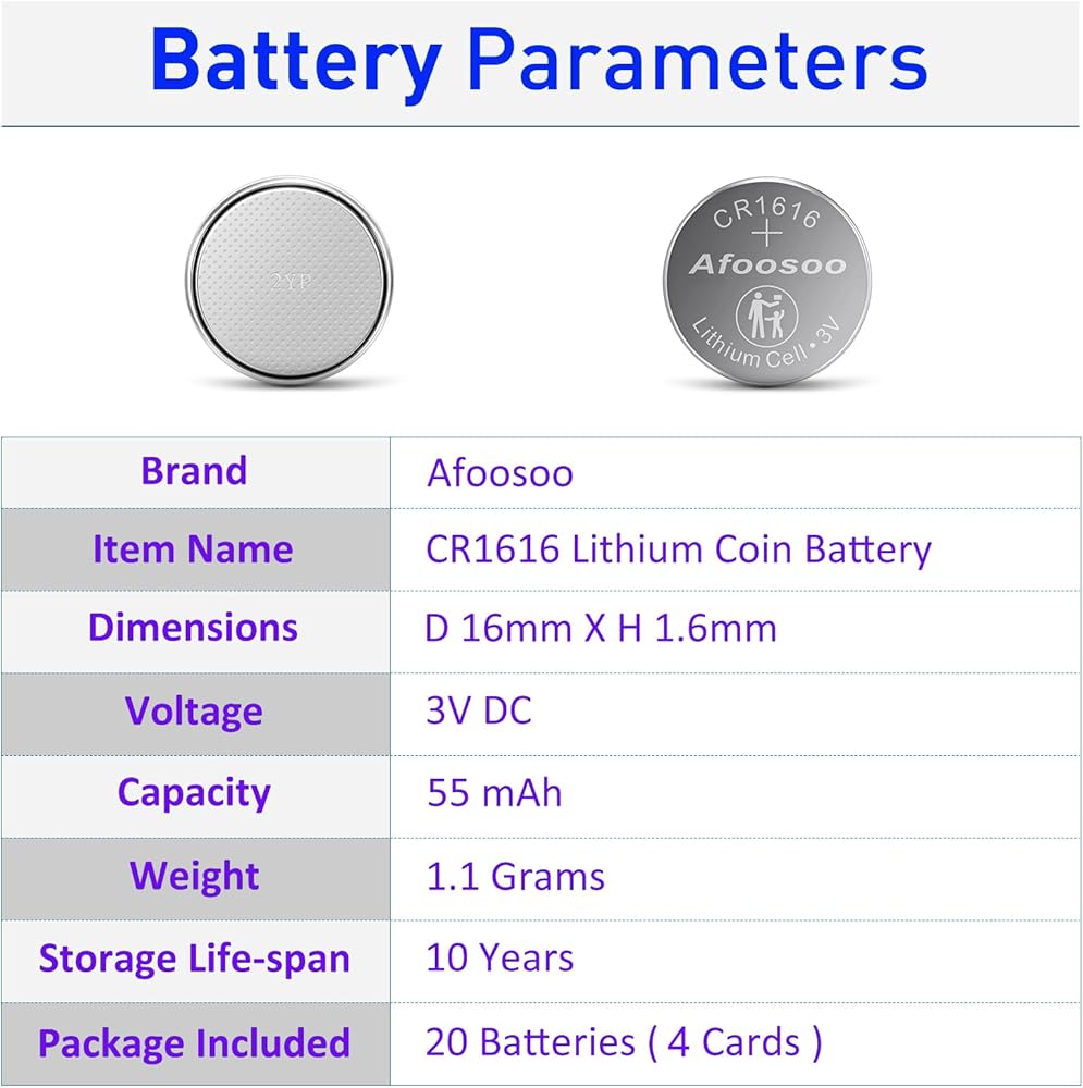 Long Battery Life High Power CR1616 Lithium Button Battery Set: 3 Volts and 55Mah high capacity coin battery, ensure Longer Battery Life and Longer Lasting Power than other standard CR1616 Batteries. Guaranteed 10 years long shelf life.