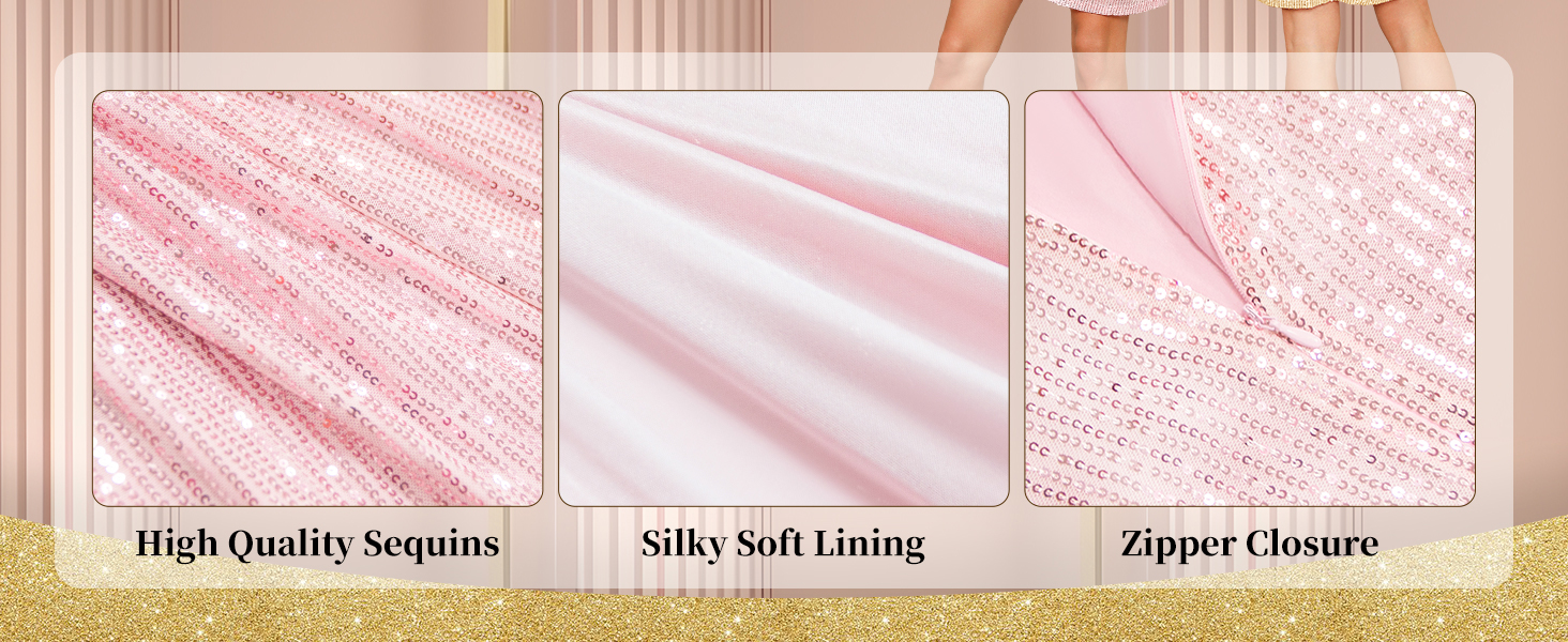Material: Premium polyester soft lining fabric and elegant sequin dress women, Glitter effect sequin material, soft lining separates the sequins, protects your skin from scratches, comfortable to wear all day
