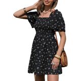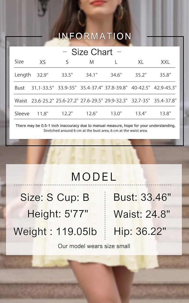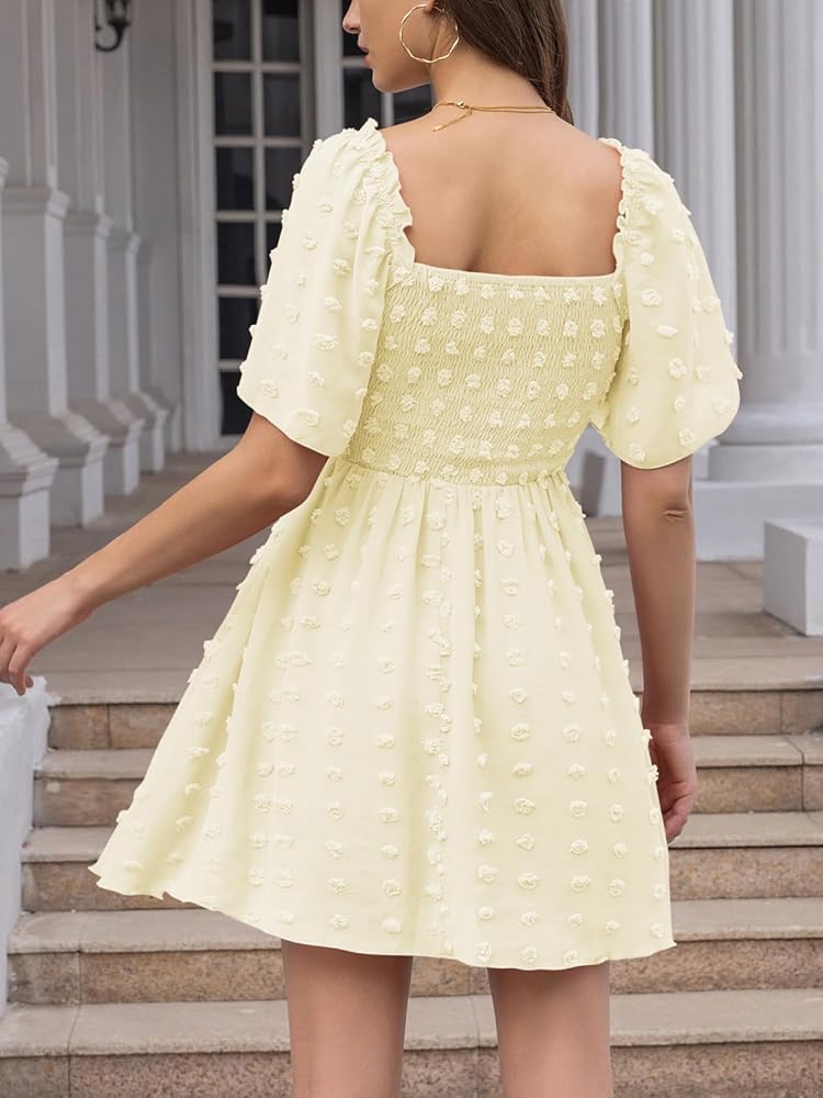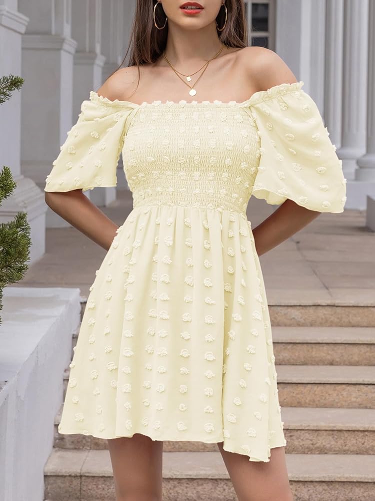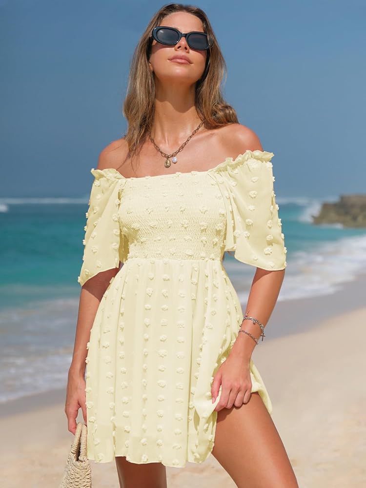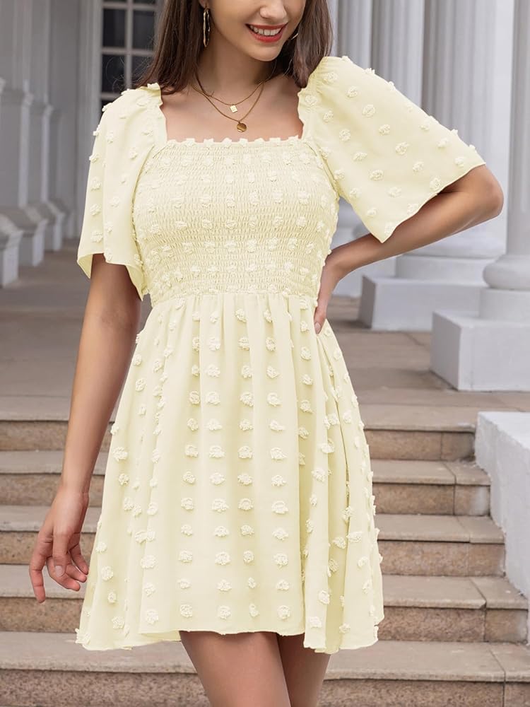 Design: This summer dress features a swiss dot fabric, a square neckline, off-the-shoulder flutter sleeves, a ruffled and shirred bodice, a semi-open back, and a flowy swing skirt with lining.