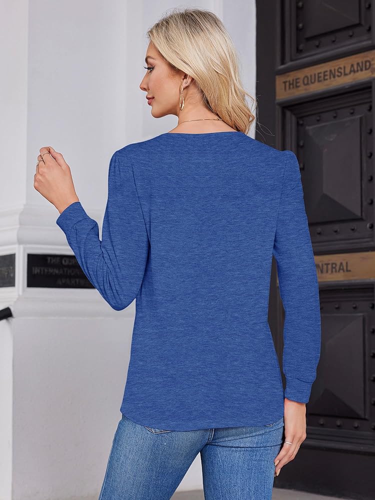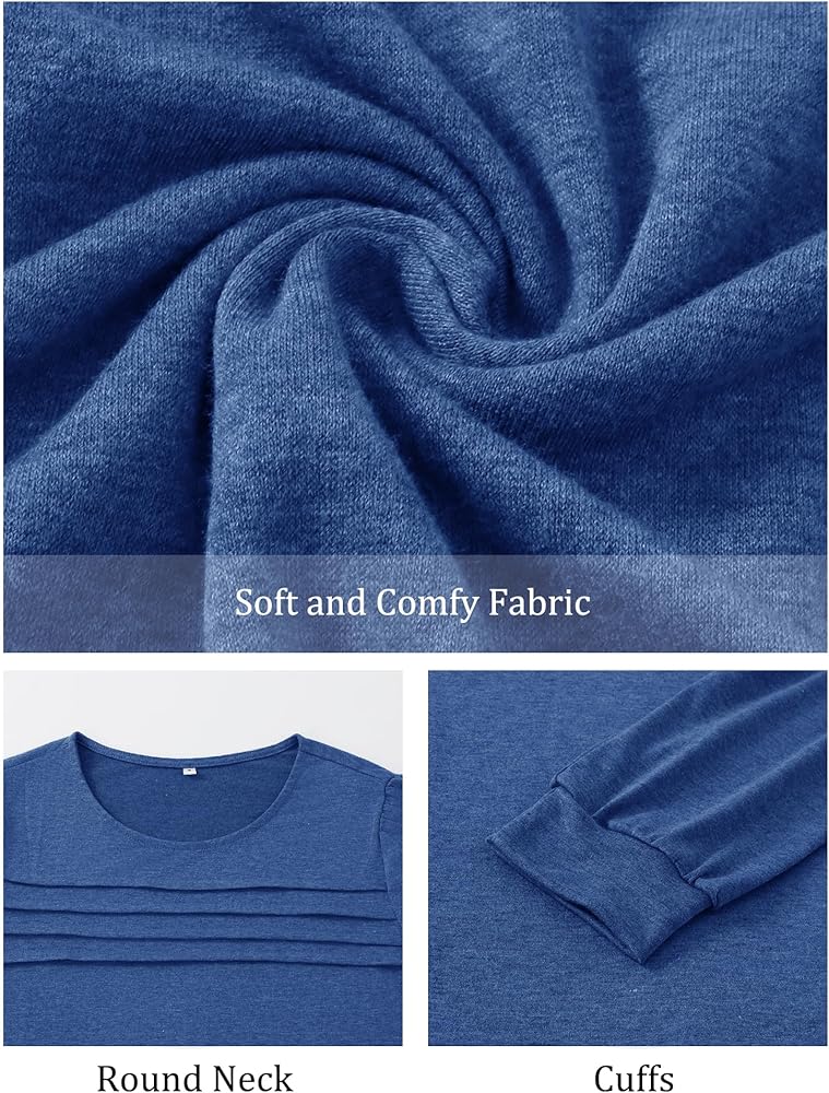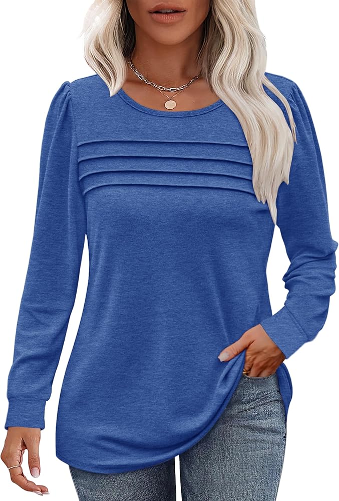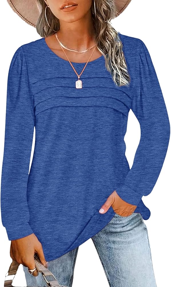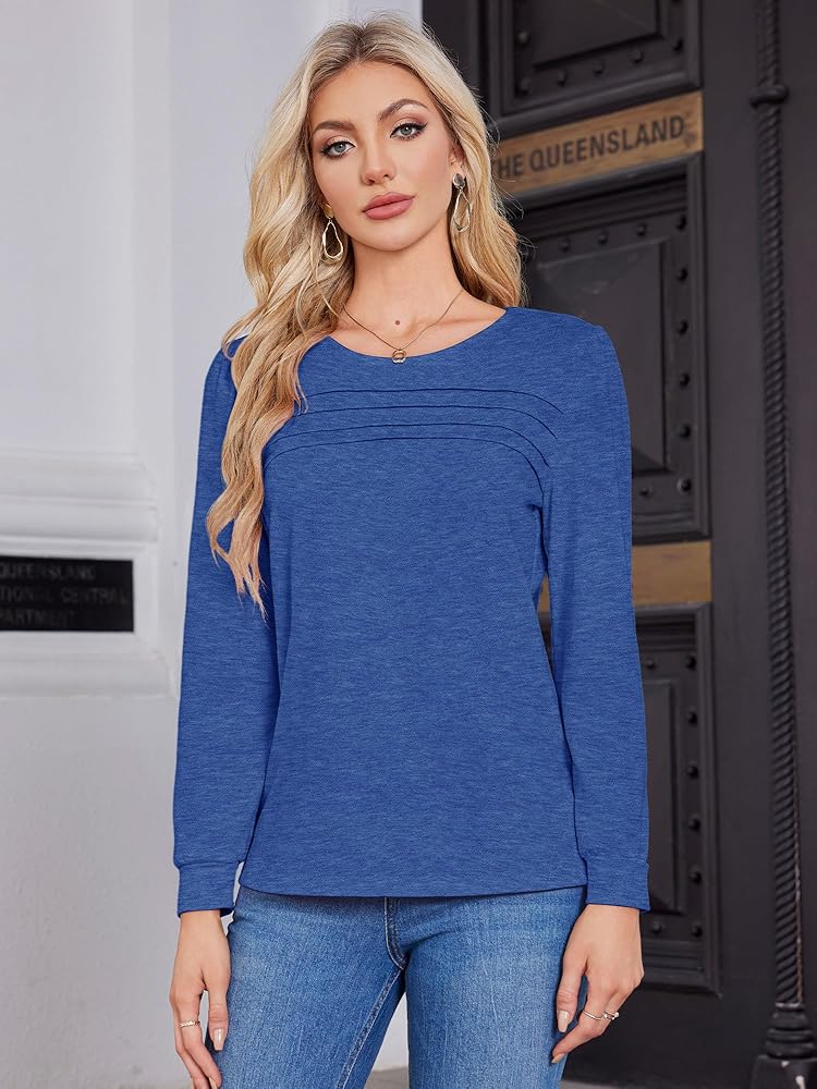 Fall Pleated Front T shirts for women Long Sleeve Crew Neck Tunic Tops Casual Loose Fit Comfy Work Blouses Dressy