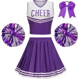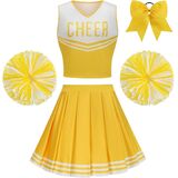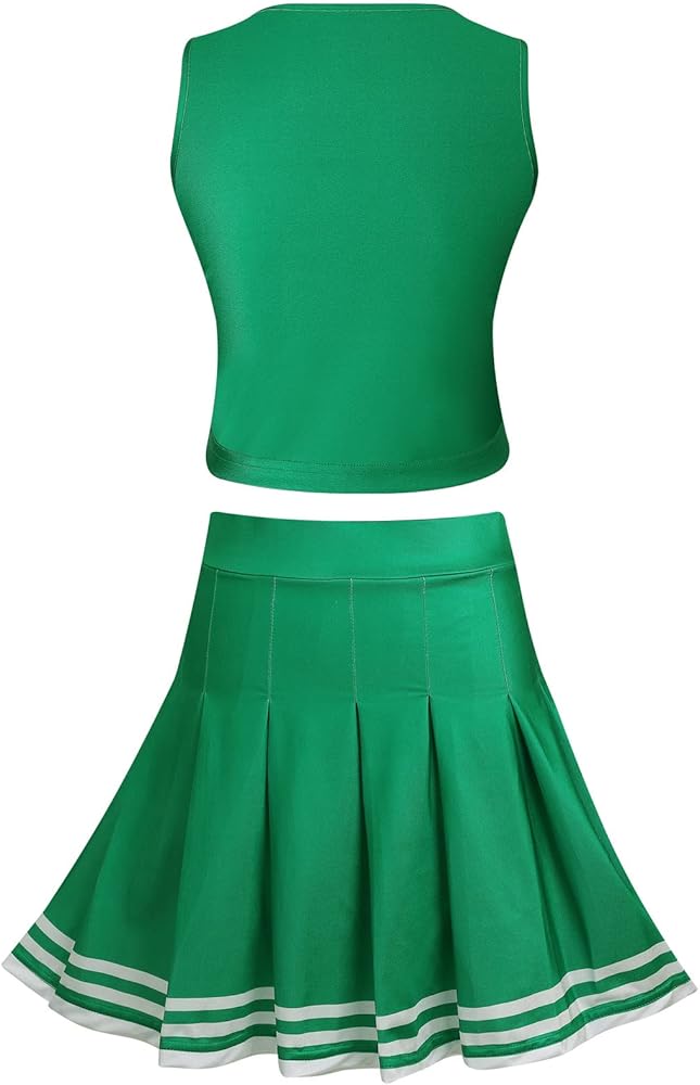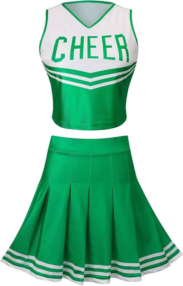 - This cheerleading features a crop top with the word CHEER and elastic pleated skirt. Polyester material is breathable and stretchy.
