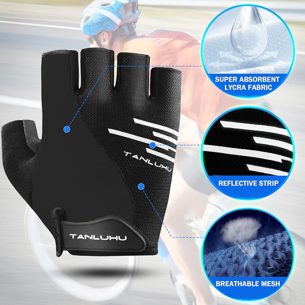 ★Breathable Fabric&Comfortable Fit★Tanluhu fingerless cycling gloves are made of high elastic LYCRA and knitted mesh fabric, to increase flexibility, comfort and fit. The AIR MESH design on the back is breathable enough to allow for longer time wearing and more flexibility.