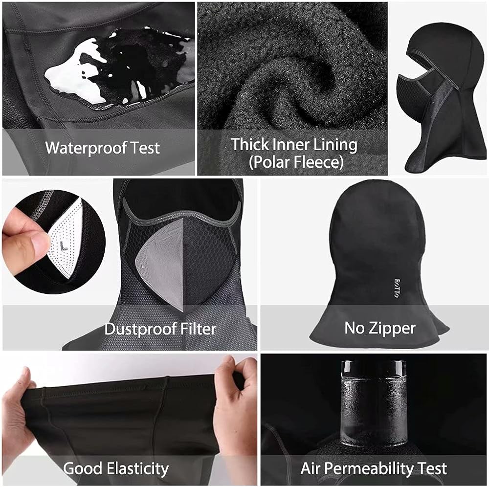 There is a filter provided which you can slide in the filter pocket in the nose section helping with the clean air. 4 choices (black with zip, black, navy blue-black,grey-black) for you, the first one has a rear zipper which you can adjust the tightness of the balaclava.
