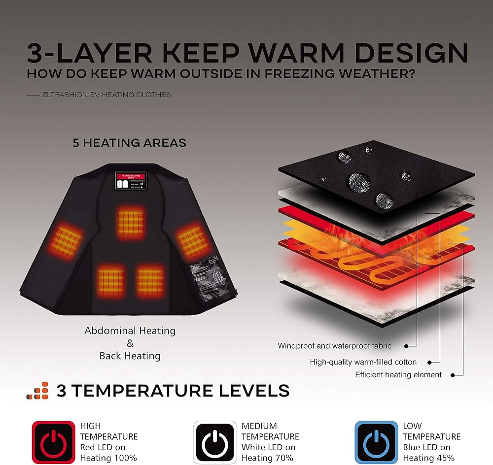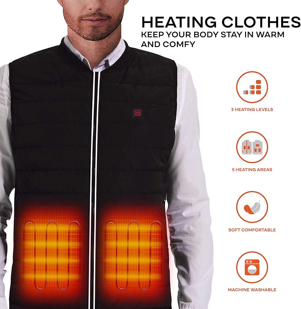 The bad weather has seriously hampered our outdoor activities and work when the winter coming. But our Heated vest will change the status quo.This vest is the free size (S~XL) slim and light design, easy warm yourself only by USB power bank charge and can adjust the appropriate temperature according to your needs. So that you can enjoy your outdoor activities in the winter.Perfect for snowmobile, motorcycle, mountain, camping, hiking, skiing, Fishing, Hunting or office routine and business outdoor.Note For Your Choosing Power BankPower Bank's Rated 5VRecommend you use a regular 5V power supply or power bank, ensure the USB and power connection port is over 2.0 A.Check your USB cable is plugged into your power bank which does not make a tight connection, which will cause overheat or out of power.(The portable charger power bank no included, need to be bought separately, please search ASIN: B07WP4W4GV).Heat Across BodyBuilt-in 5 carbon fiber heating pads across the front and back to make you feel warm in 360°.Long-lasting WarmthFast heat in seconds with 5V Power Bank (USB plug compatible with the most power bank in the market with output 5V/2A); more than 8 working hours.Easy CareRemove the battery, recommend hand wash, machine wash (in laundry bag) in cold water.Air dry(Do not twist or wring).3 Heating ModeAdjust 3 heating settings (high, medium, low) with just a simple press of the button.Built-in Thermal Protection ModuleOnce it is overheated, it would stop until the heat return to the standard temperature.Carbon Fiber Far Infrared Ray (FIR) Heating MethodThe heating material is made from carbon fiber, which is safer, softer and more healthy than the original heating method. It is more effective in promoting blood circulation, relieving stress, tension, muscle pain and stiffness.