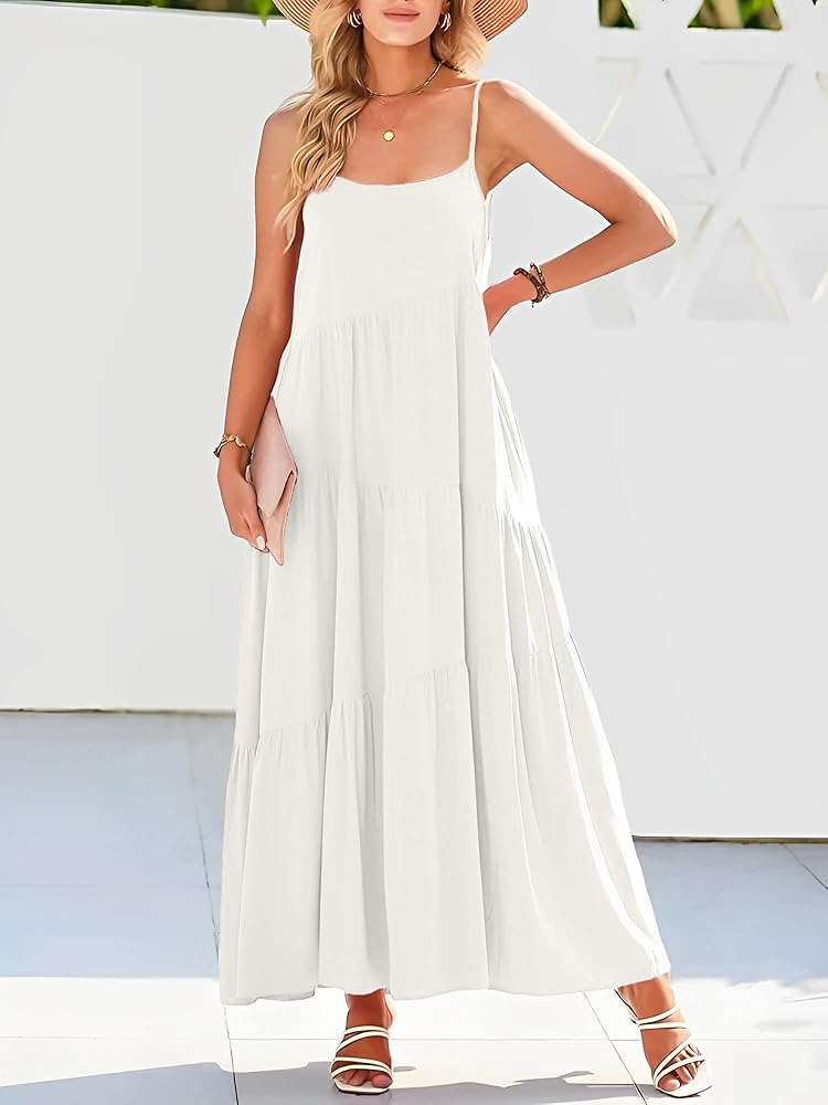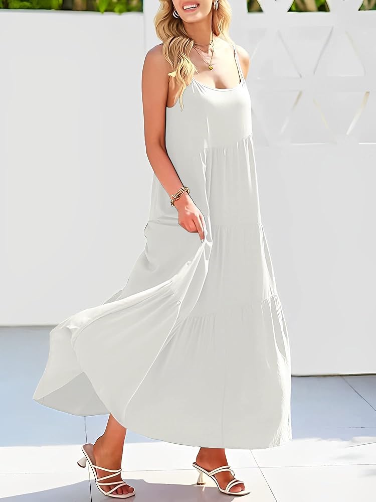Features: The maxi dress adjustable spaghetti strap, asymmetric tiered, flowy swing hem. Loose fit, casual style, sleeveless sexy long dress.