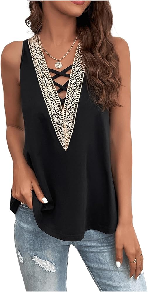 Casual tank tops for women, design with contrast guipure lace, v neck, criss cross front, perfect to show off your gorgeous beauty, make a charming and attractive look. This tank top is easy to match with jeans, pants, skirts, jackets, coats, tights, high waist shorts