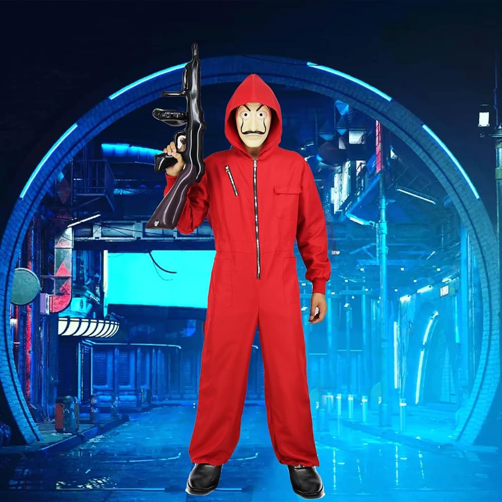 Complete Look: Steal the spotlight with our red money costume. This ensemble includes a red jumpsuit, the iconic mask, and an inflatable toy prop - all the essentials to immerse yourself in the world of daring rob.