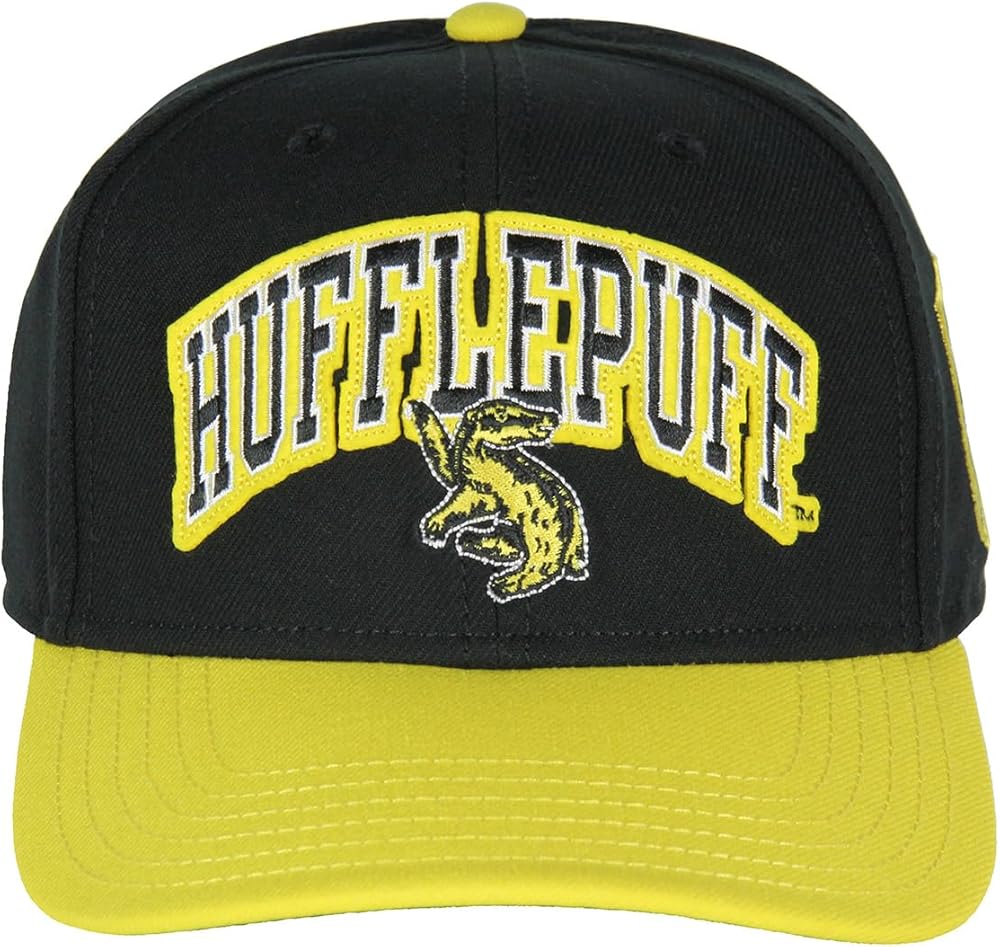 The Hogwarts School of Witchcraft and Wizardry is the place where young wizards and witches go to learn the mysteries of magic. The students are divided into four different houses. The houses are Slytherin, Gryffindor, Ravenclaw, and Hufflepuff. These officially licensed snapback hats feature a large front embroidered House Animal logo and script design and a House Crest Patch on the side of the crown. The hats are done in color, representing the corresponding house. Fits ages 14 and older best