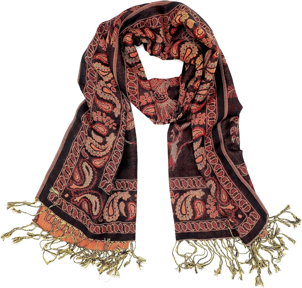 This pashmina rave scarf has a subtle pattern and gradations of color which gives a very bohemian feel to spring and summer clothes. It can be used as a light blanket to bring with you on nature walks or used in your home as furniture drapery or tapestry.
