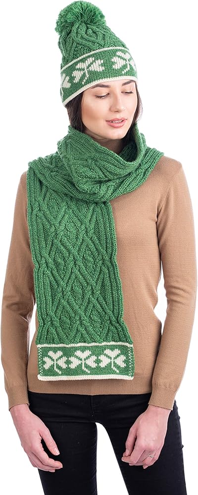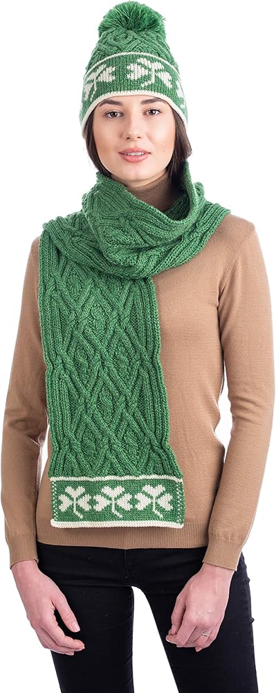 This gorgeous and chunky scarf from SAOL knitwear is the perfect St. Patrick's Day accessory. Knit from 100% Merino wool, the Traditional Irish Shamrock Aran Wool Scarf is luxurious, warm, and super soft to the touch. Featuring a motif of cable and diamond patterns found on traditional Irish fishermen's sweaters and thought to represent the promise of a good catch, this scarf draws on a long history of Irish pride. Topping off the scarf are three shamrocks knit into either end. The shamrock is the plant most associated with Ireland and St. Patrick himself, symbolizing the conversion of the island by St. Patrick to Catholicism when he is said to have used the three leaves as a metaphor for the holy trinity. Available in classic white and navy (with green shamrocks) and Kelly green with contrasting white shamrocks. Shop the entire look with the Shamrock Aran Wool Hat.