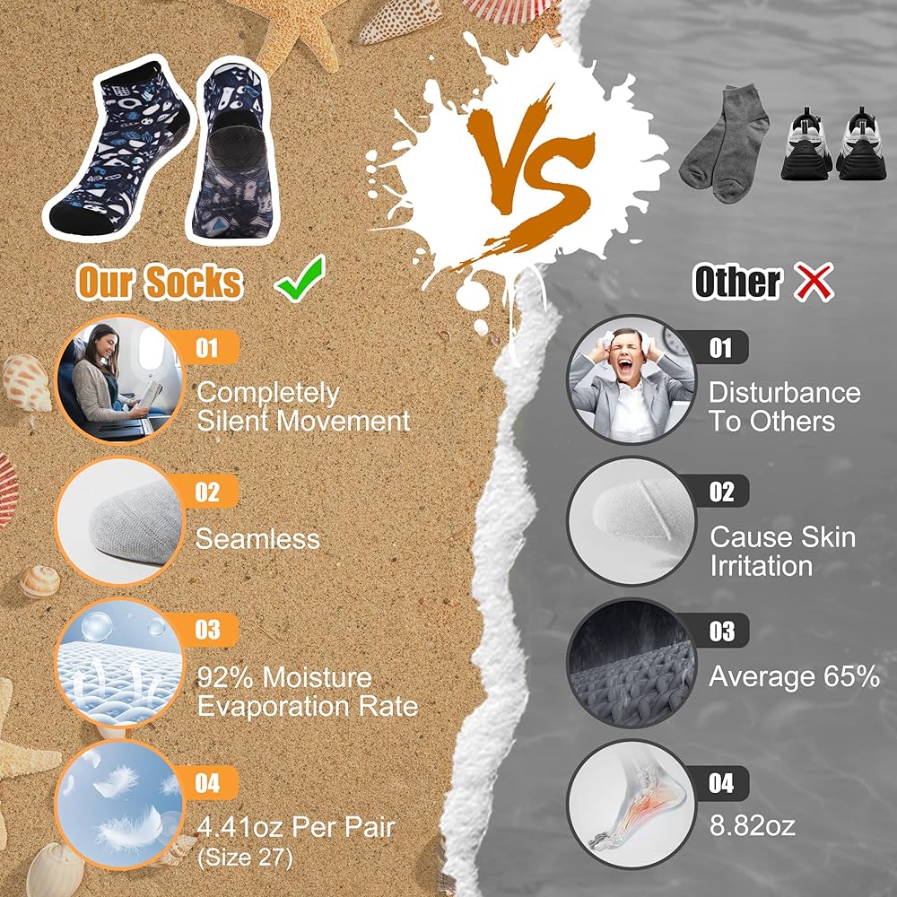 ♥Ultra Lightweight: Super lightweight and flexible, make you feel great freedom and comfortable in wearing. It can activate all of your feet muscle and tendon, and allow your feet to adapt to the ground perfectly. Allowing users to easily put on and take off. The sole of beach socks is flexible to bend roll and keep its shape after. Occupy less space, suitable for travel, trip, vacation, holiday. You can carry them in your backpack, suitcase or even your pocket!