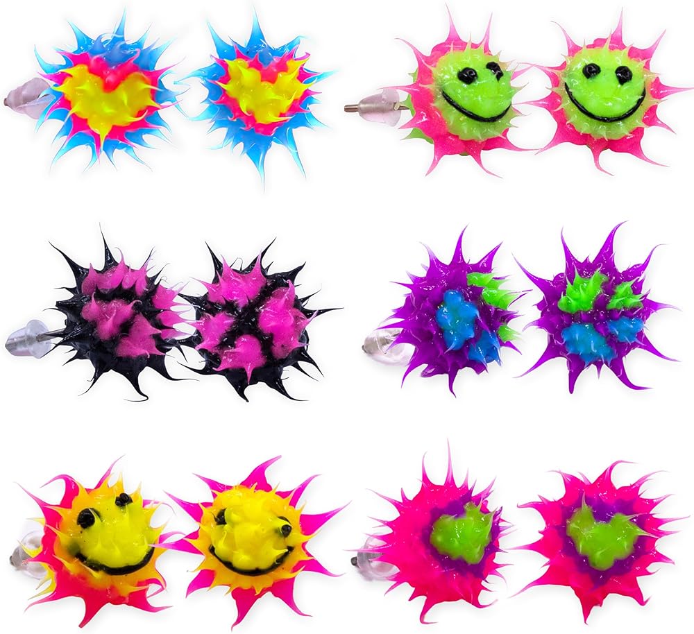 6 pairs of fun kidcore earrings for teen girls, made of spiky silicone; Smiley earrings with a cool 90s retro vibe