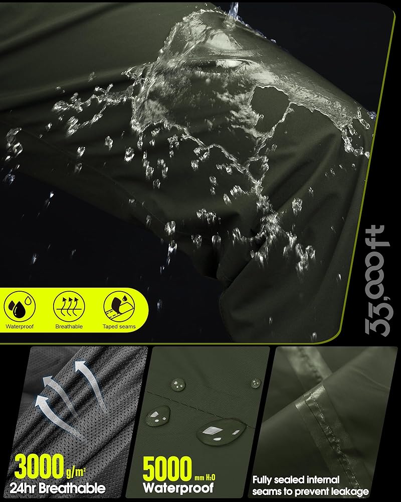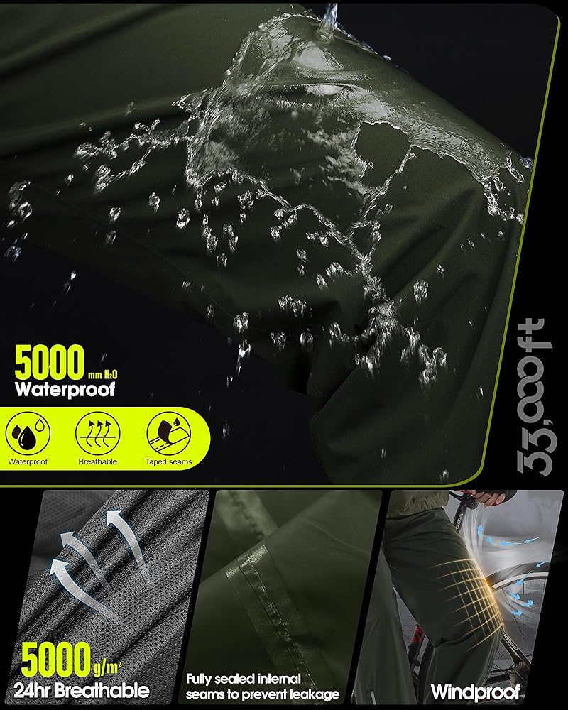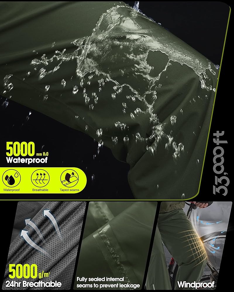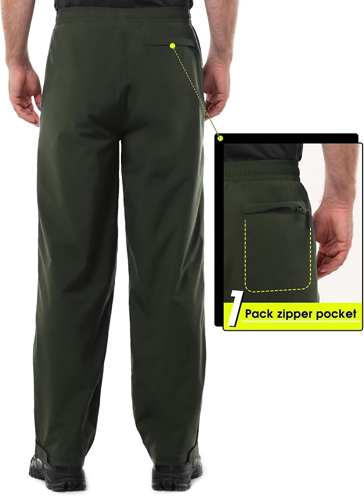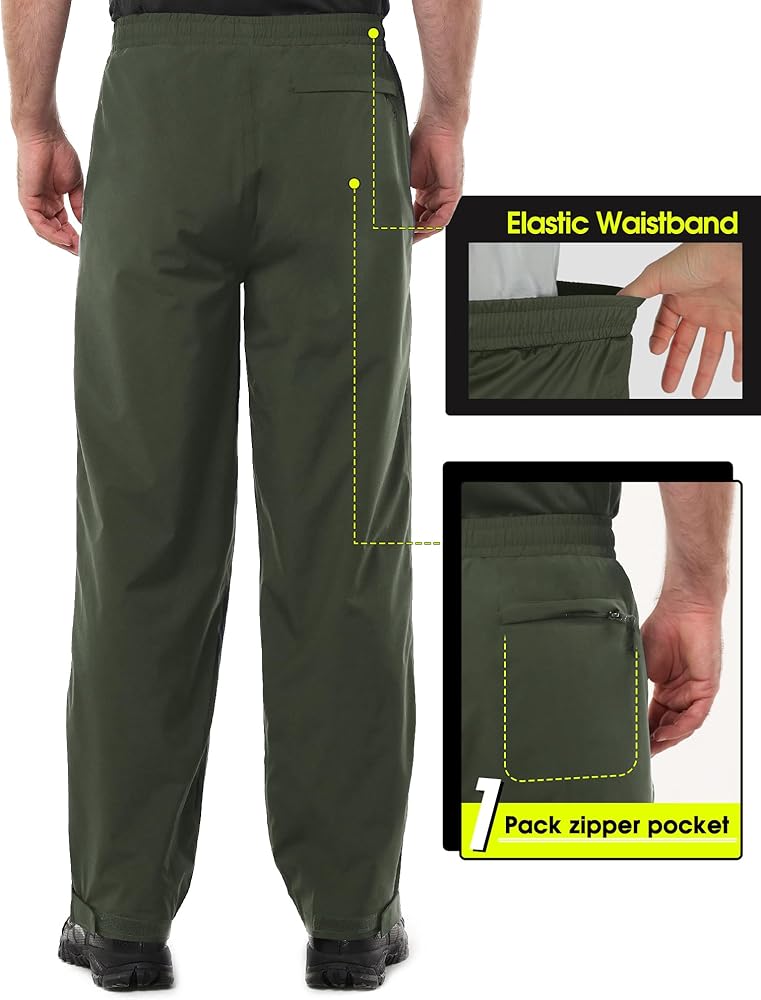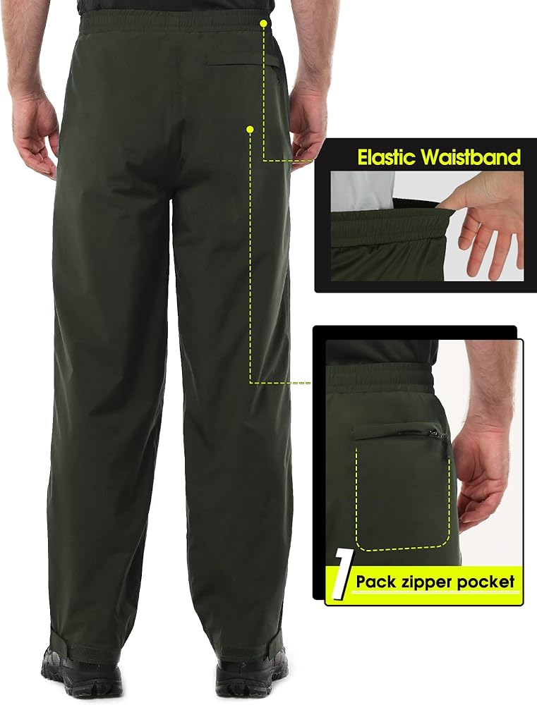 Waterproof & Breathable: Men rain pants with 5000mm Waterproof Rating and all seams are sealed. Prevents water from leaking through the fabric and seams. 3000gm Breathability Rating, making sure you dry on the inside.
