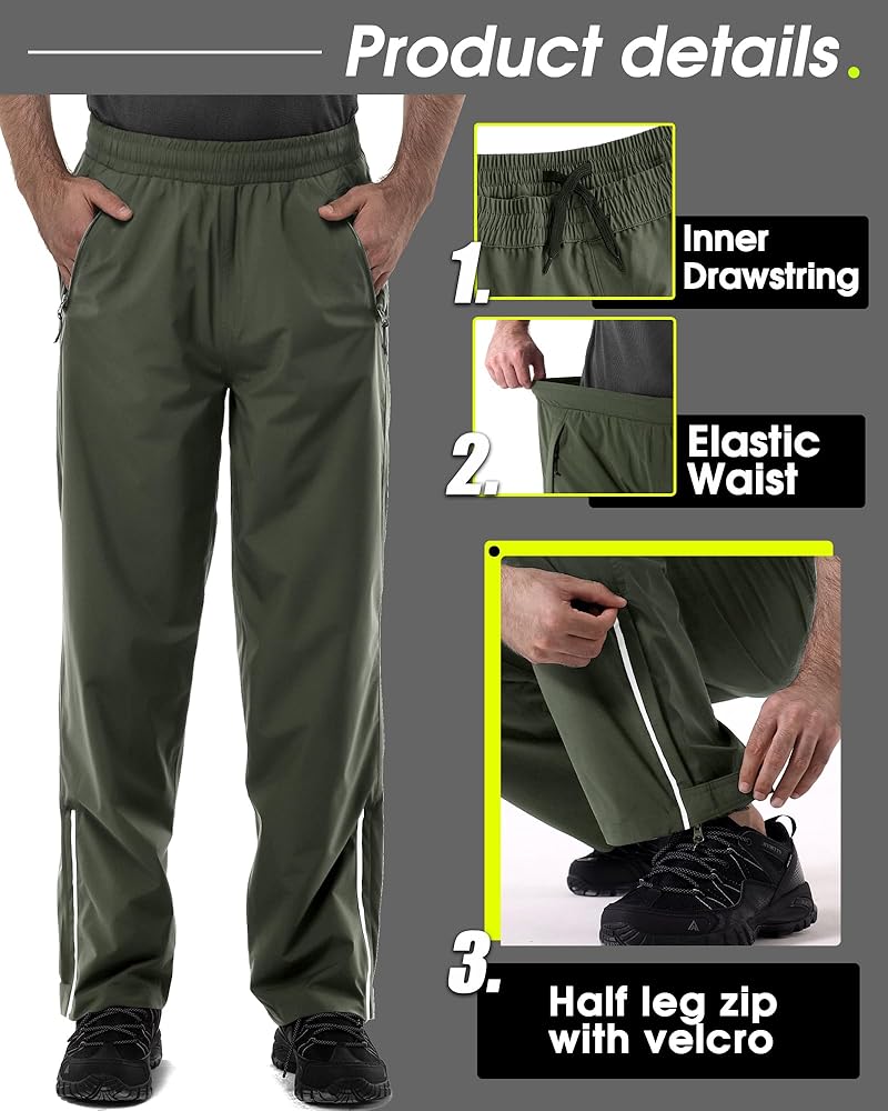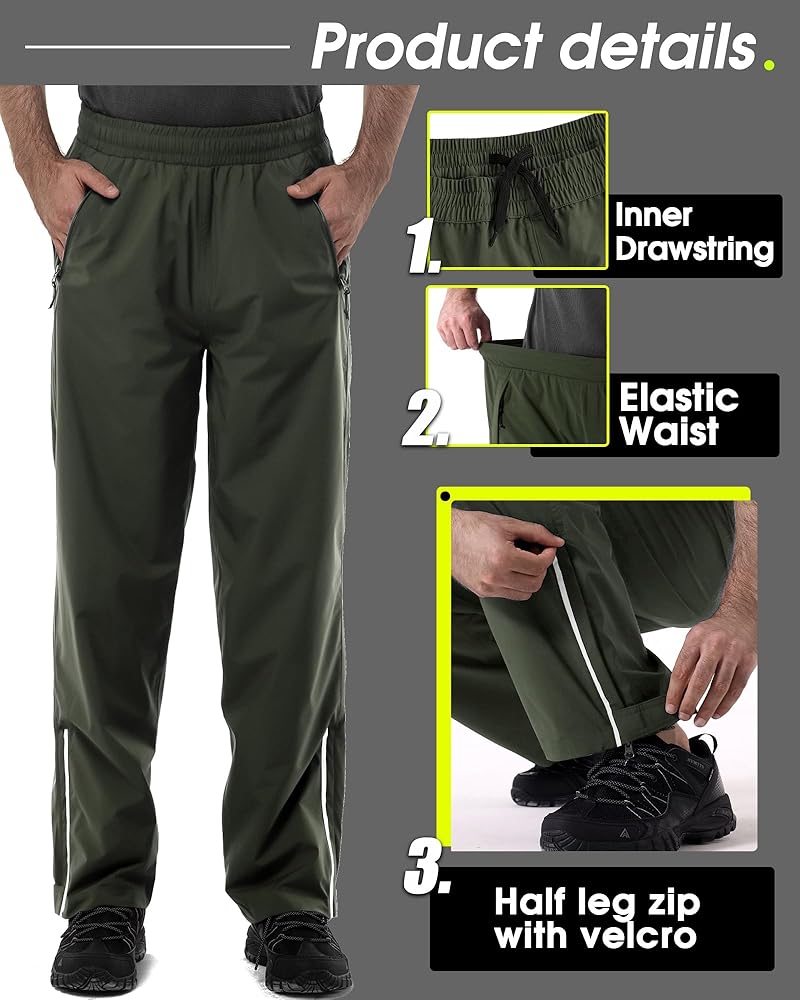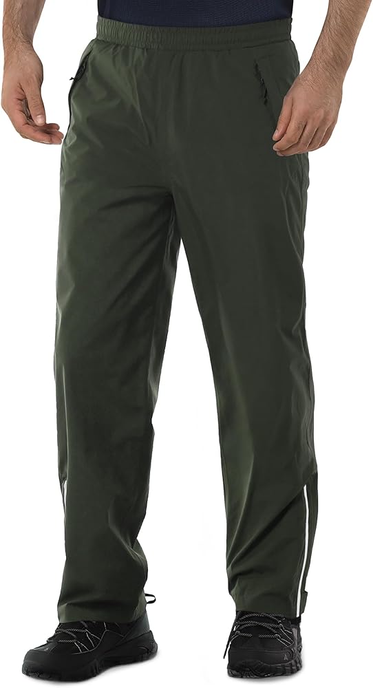 Convenient Design: This rain pants men waterproof lightweight features half leg zip and velcro closure with reflective riping slit that allows expand the width of the ankle cuff to accommodate over boots, keep your shoes dry.
