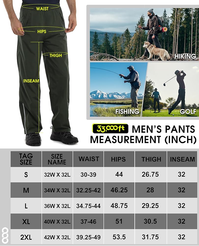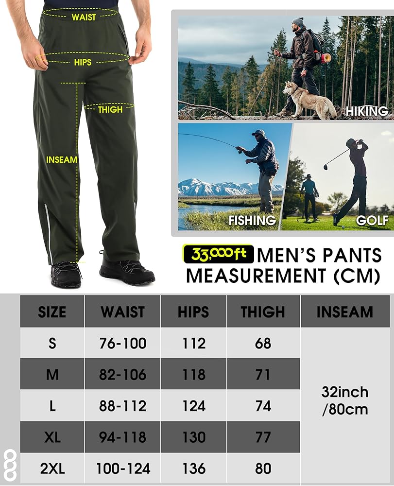 Occasion: Rain pants for men waterproof overpants, perfect for hiking, camping, cycling, fishing, traveling and all other outdoor activities. This stylish and functional rain pants should accompany you when you are out adventure and on your daily commute.