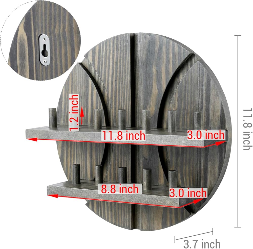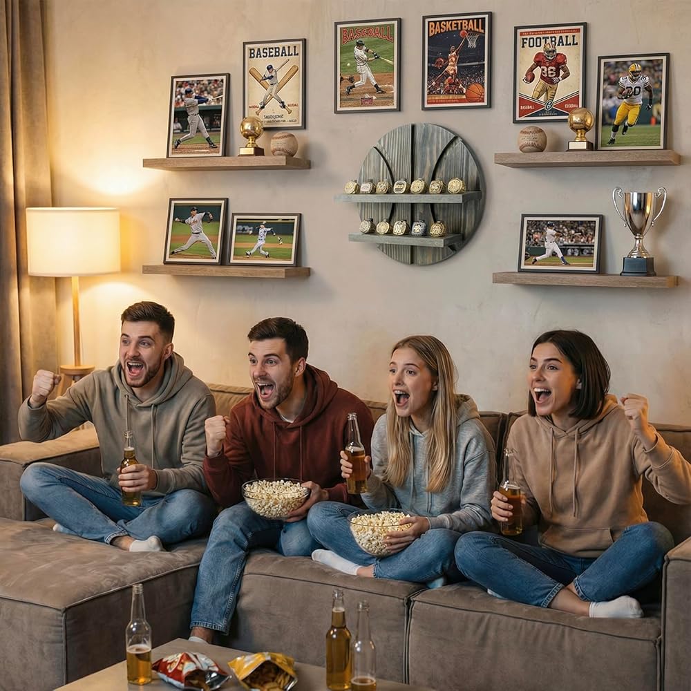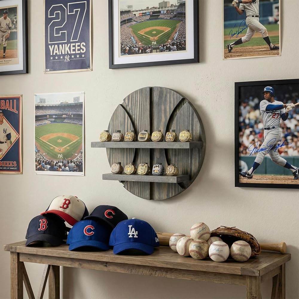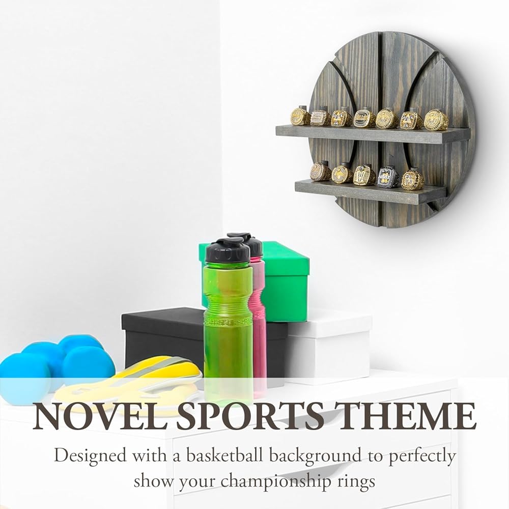 Start displaying championship rings with pride with this rustic burnt solid wood ring holder in a basketball-themed design. Whether showcasing NBA championship rings, your college basketball rings, or regular jewelry rings, this display shelf is the perfect way for basketball fans to show off ring collections and hard-earned accomplishments. Featuring 12 built-in pegs that each hold a single large sports championship ring, or several men's or women's standard jewelry rings. The basketball cutout brings a sense of pride and team spirit, while the durable solid wood construct gives this rings storage adds a touch of rustic décor that complements any style. The rustic burnt brown finish and basketball cutout backing with aesthetic carved out lines make this ring holder a visually stunning addition to any home, perfect for any sports fan and a great gift for the athlete or basketball enthusiast in your life.