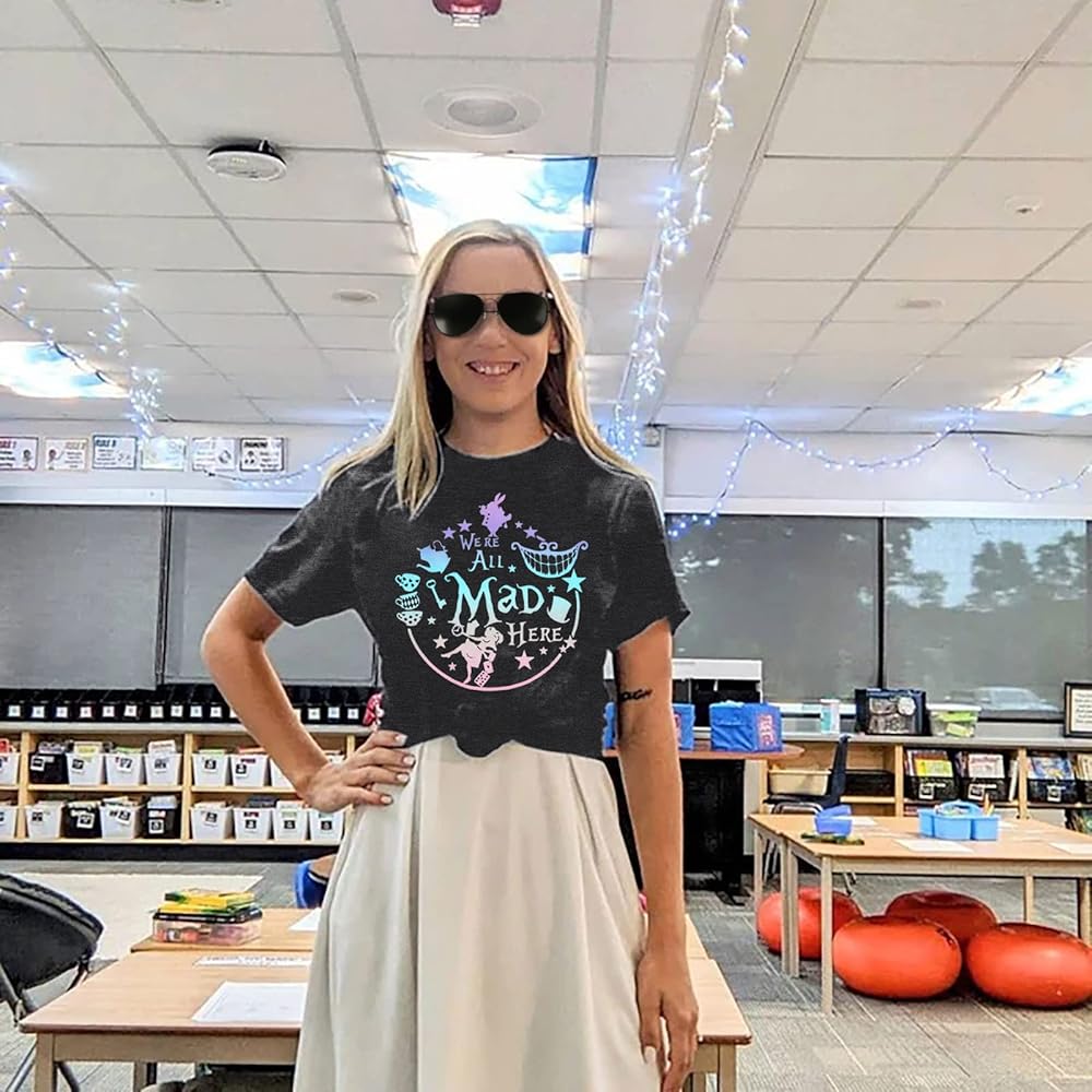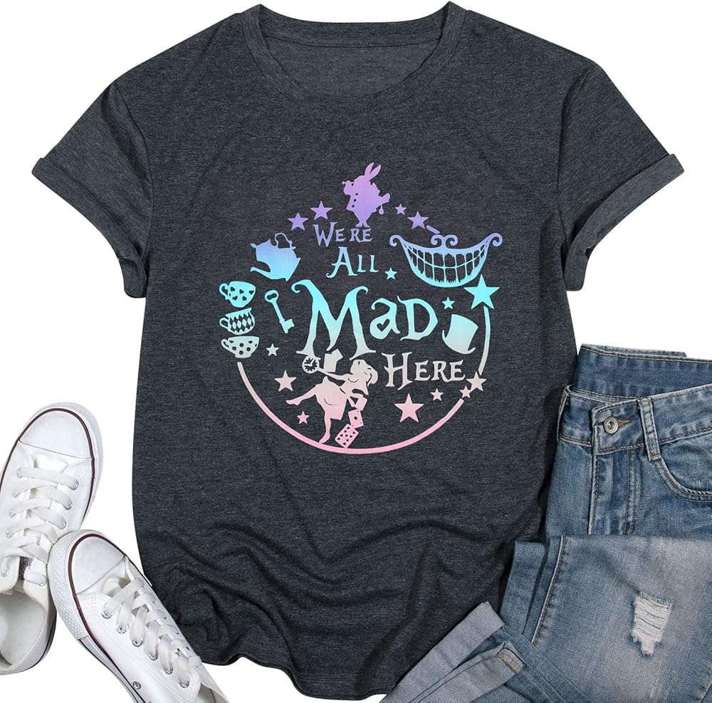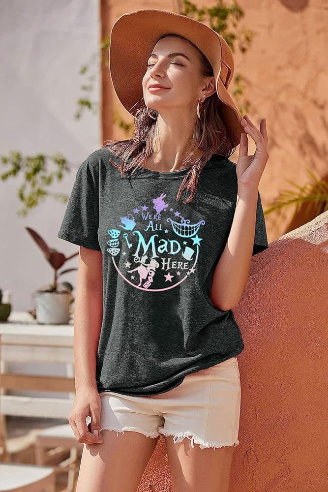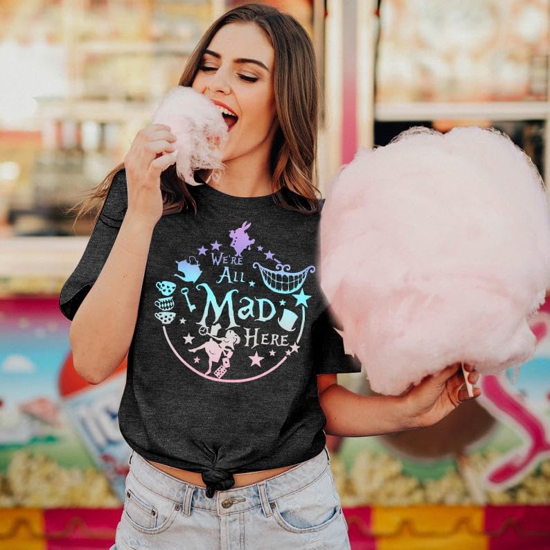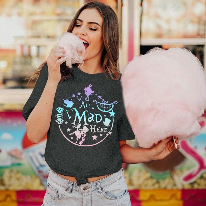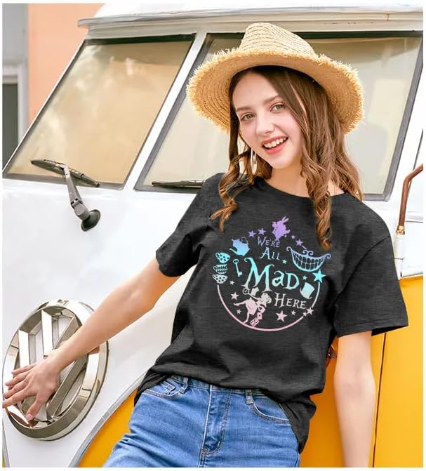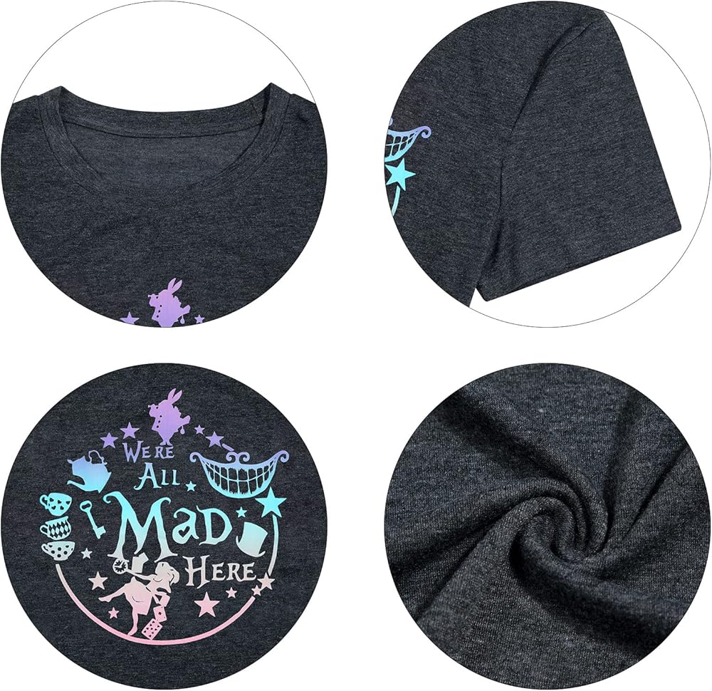 Features: We're all mad here shirt,cute graphic tees, funny sayings shirts, summer short sleeve tee tops, round neck,mad hatter and cheshire cat printed,wear it by your alice themed birthday party ,comfortable and fantastic.