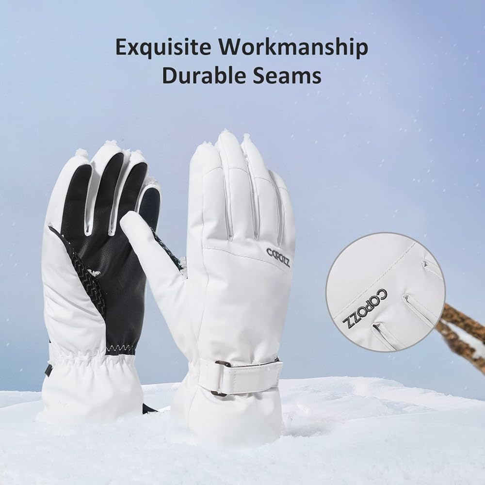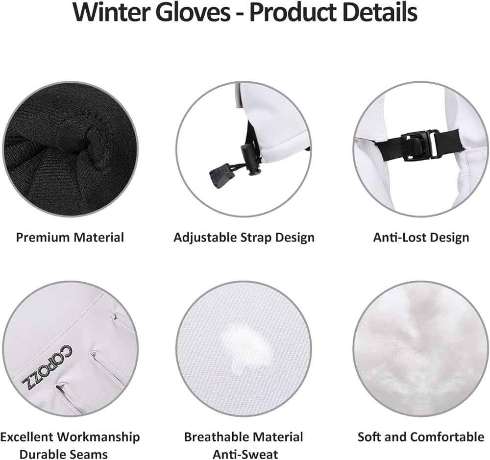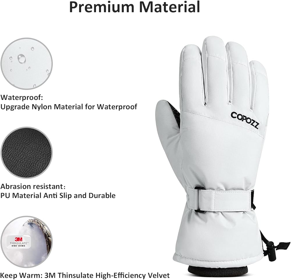 [Premium Comfortable Material]: The Ski Gloves is made from High elastic T800 twill fabric, 3M Thinsulate insulation, TPU and Acrylic fiber. Premium Material makes this winter gloves more comfortable, durable and warmer than other regular gloves. Besides, the gloves are breathable and sweat resistance. With COPOZZ snow gloves, keep you warm from the cold weather.