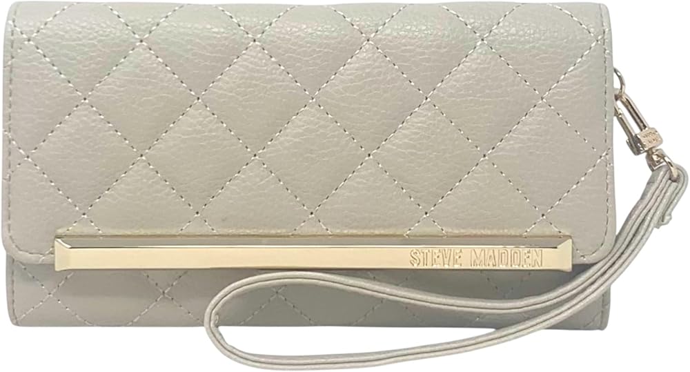Show off your elite sense of style with the Logobar Trifold from Steve Madden. Soft PU leather construction. Logo hardware accents including removable logo charm. Snap closure. Zippered back exterior coin pouch. Interior features slip pocket for currency, 15 card slots and a transparent ID window. Bottom width 7 3/4 inches x height 4 1/2 inches x depth 1 inch.