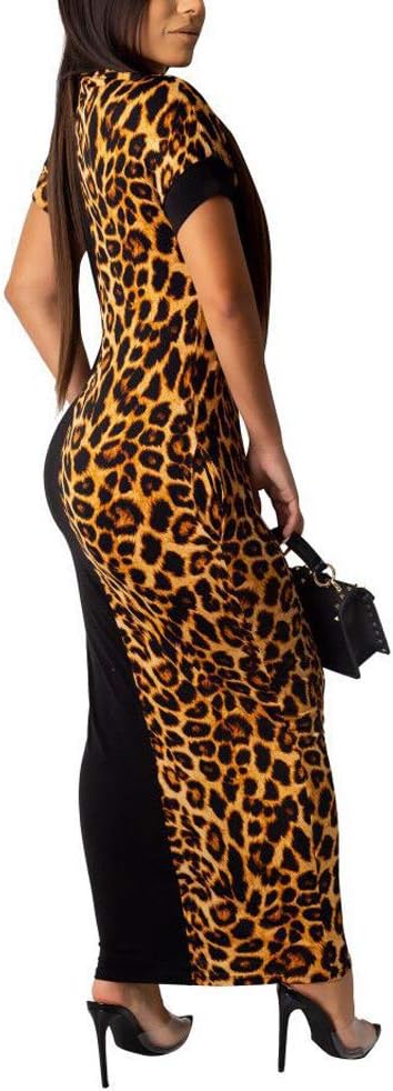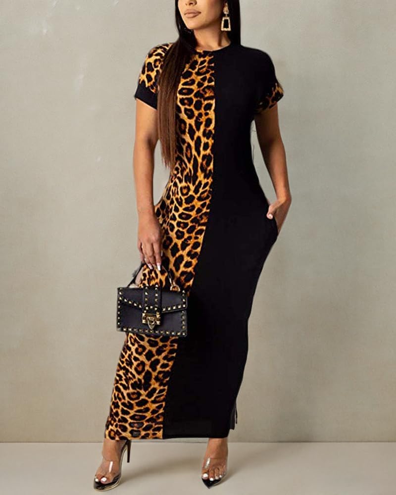 Womens Leopard Print Long Dresses - Short Sleeve Bodycon Club Midi Dress with Pockets