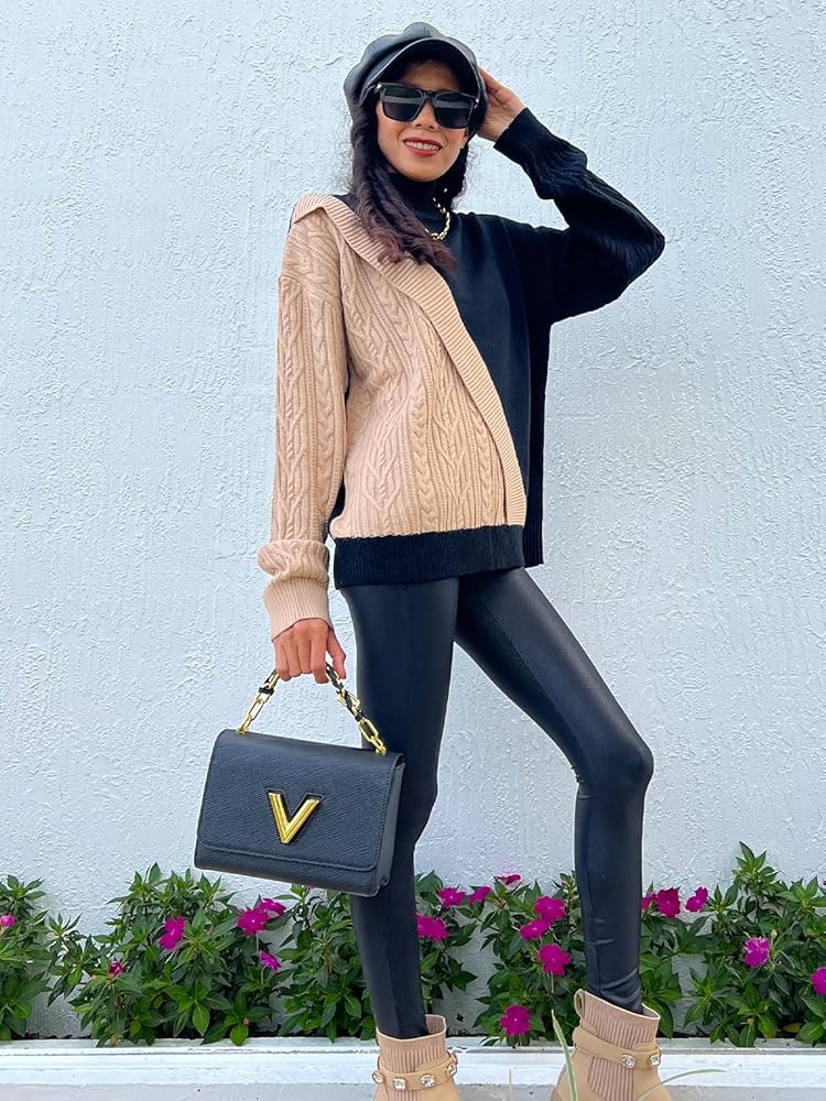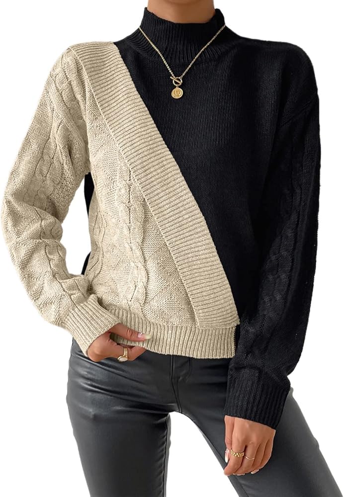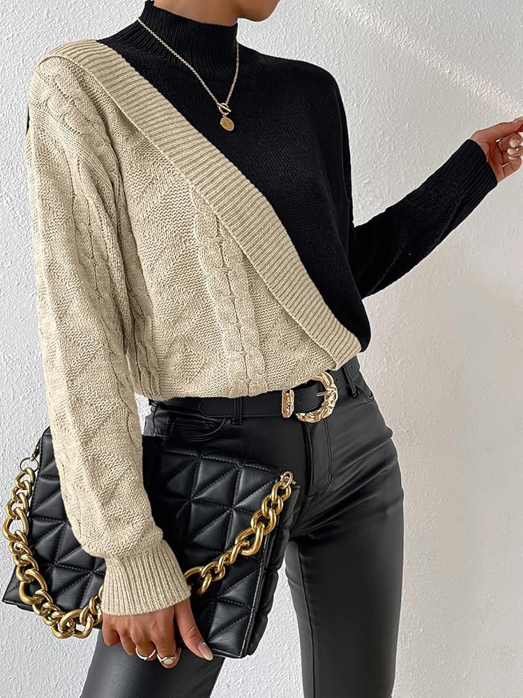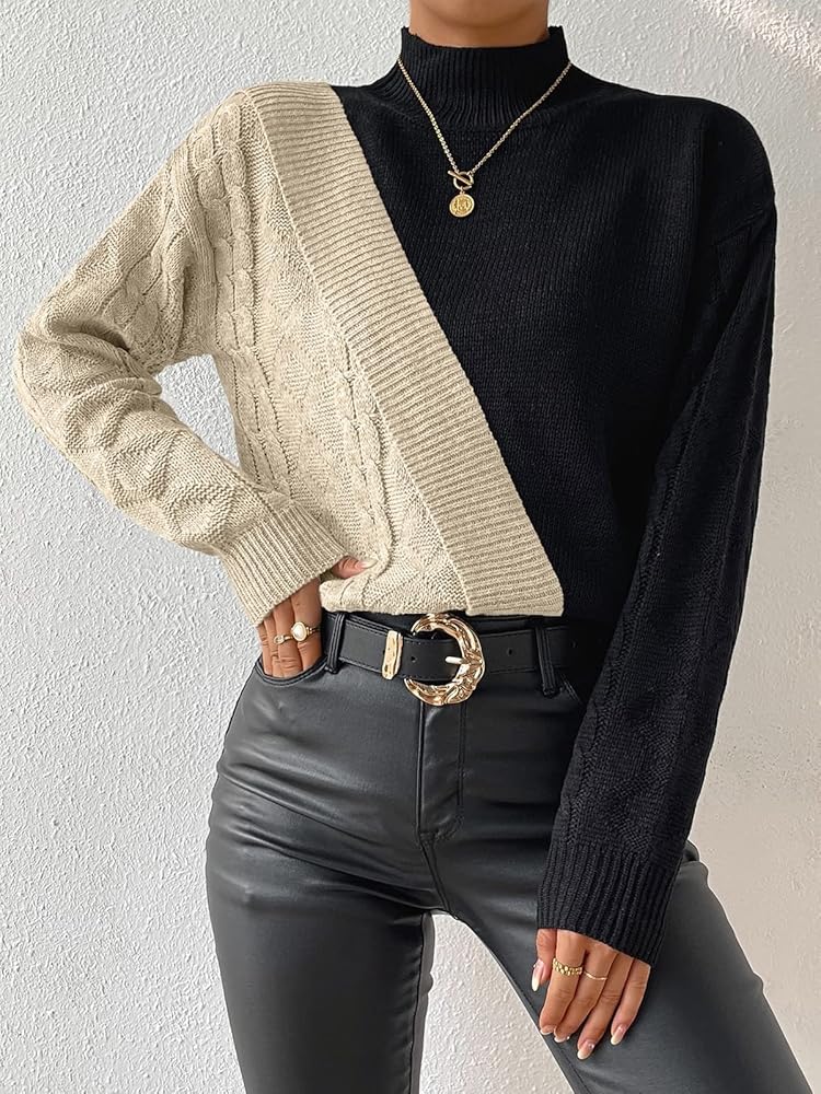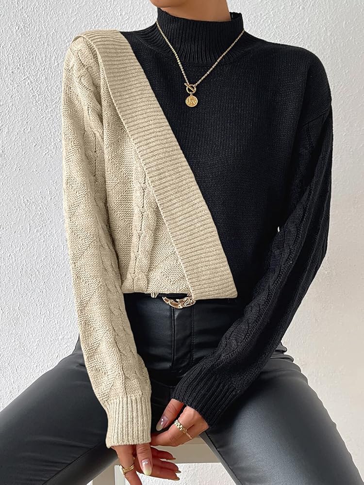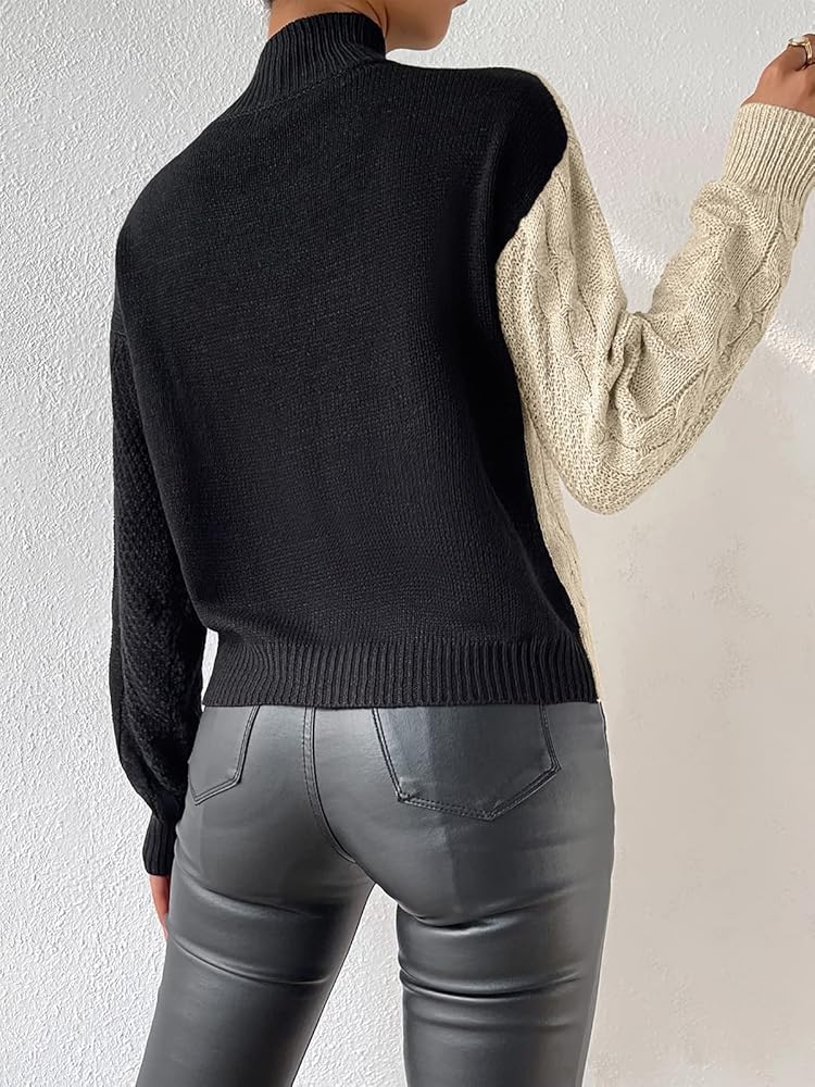 ⛷️FEATURES:This sweater is color blocked in two colors and is knitted in a different way for stitching. The two sides of the sleeves are different colors and knitted in different ways, and the half turtleneck design makes this sweater very fashionable and unique.