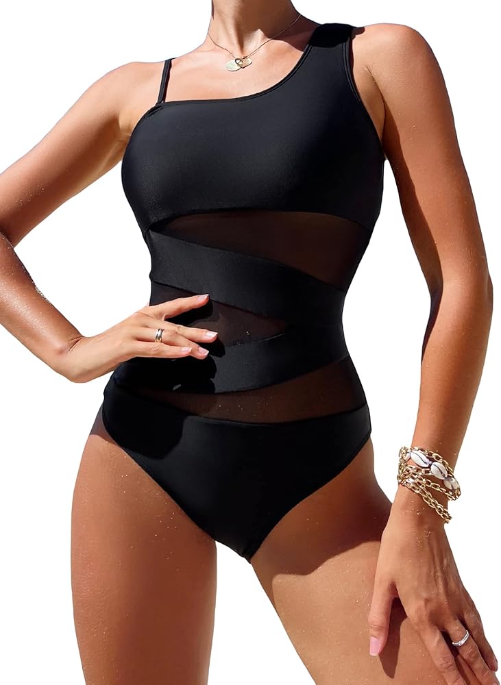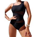 WDIRARA Women's Colorblock Cut Out One Piece Swimsuit Mesh One Shoulder Bathing Suit