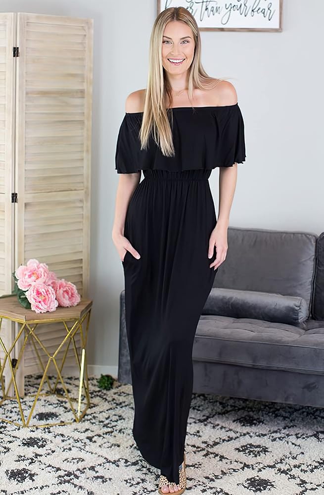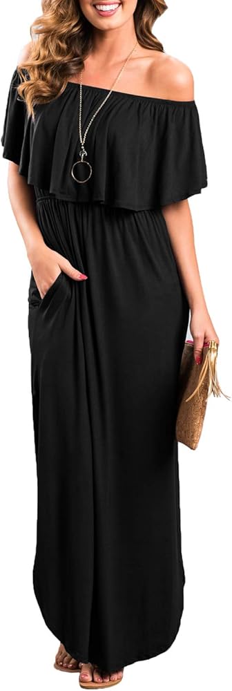 Design: The design of off shoulder was not too tight or too loose.And the off-the-shoulder neckline highlights your collarbone while hiding your upper arms with the ruffle.Side split design makes the dress spins beautifully. Look perfect with this maxi dress by pairing it with your favorite necklace and sandal.