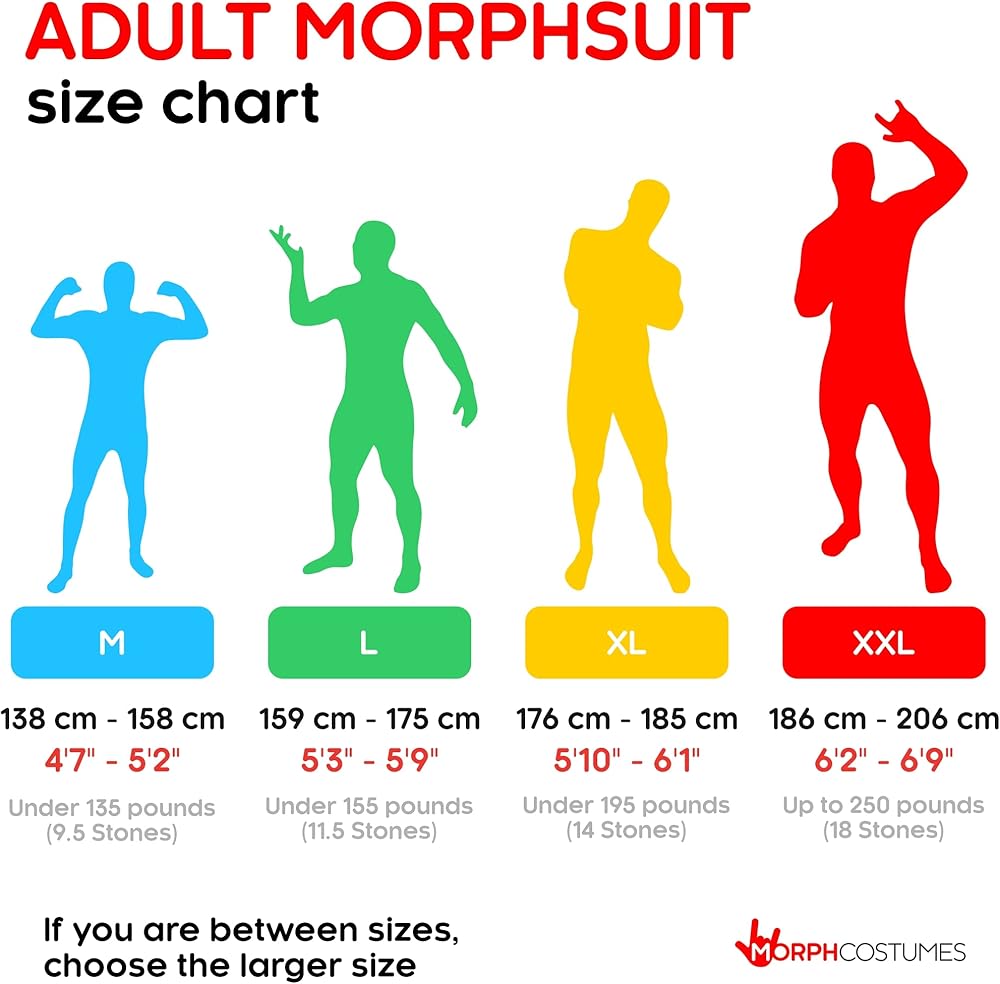 Get you morph suit on. They're perfect for parties, Halloween and events where you want to stand out. morph suits come in 70 different colors and patterns, from black to blue, tuxto tie-dye there is a morph suit for every occasion, parties to prom, charity runs to Christmas, Halloween to happy birthdays, stag weekends to student nights, sports events to just going down to the shops to pick up the milk. are the costume phenomenon taking over the world. Morph suits are all-in-one lycra suits that cover the whole of your body from head to toe. specially designed so you can breathe through them, drink through them and see through them but no one can see you. check us out on Facebook, 1.5 million people can't be wrong. Please ensure you order the correct size to suit you medium-m up to 5' 4 inch large-l if you are taller than 5' 4 inch but shorter than 5' 10 inch. Extra large-xl if you are taller than 5' 10 inch but shorter than 6' 3 inch. Xxl if taller than 6' 4 inch.