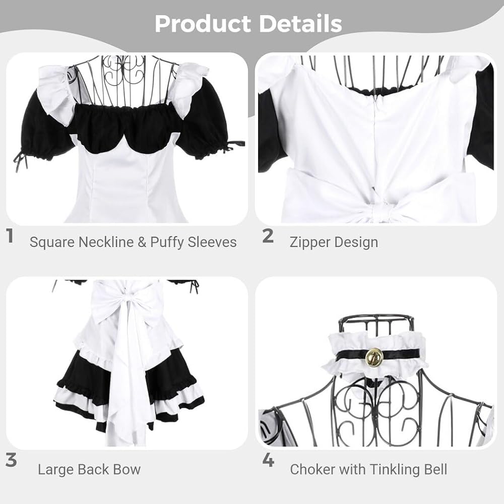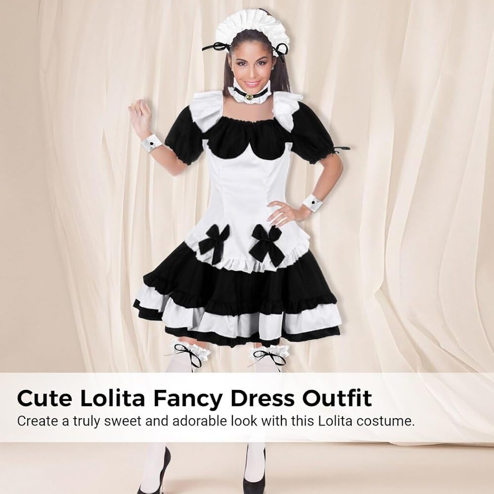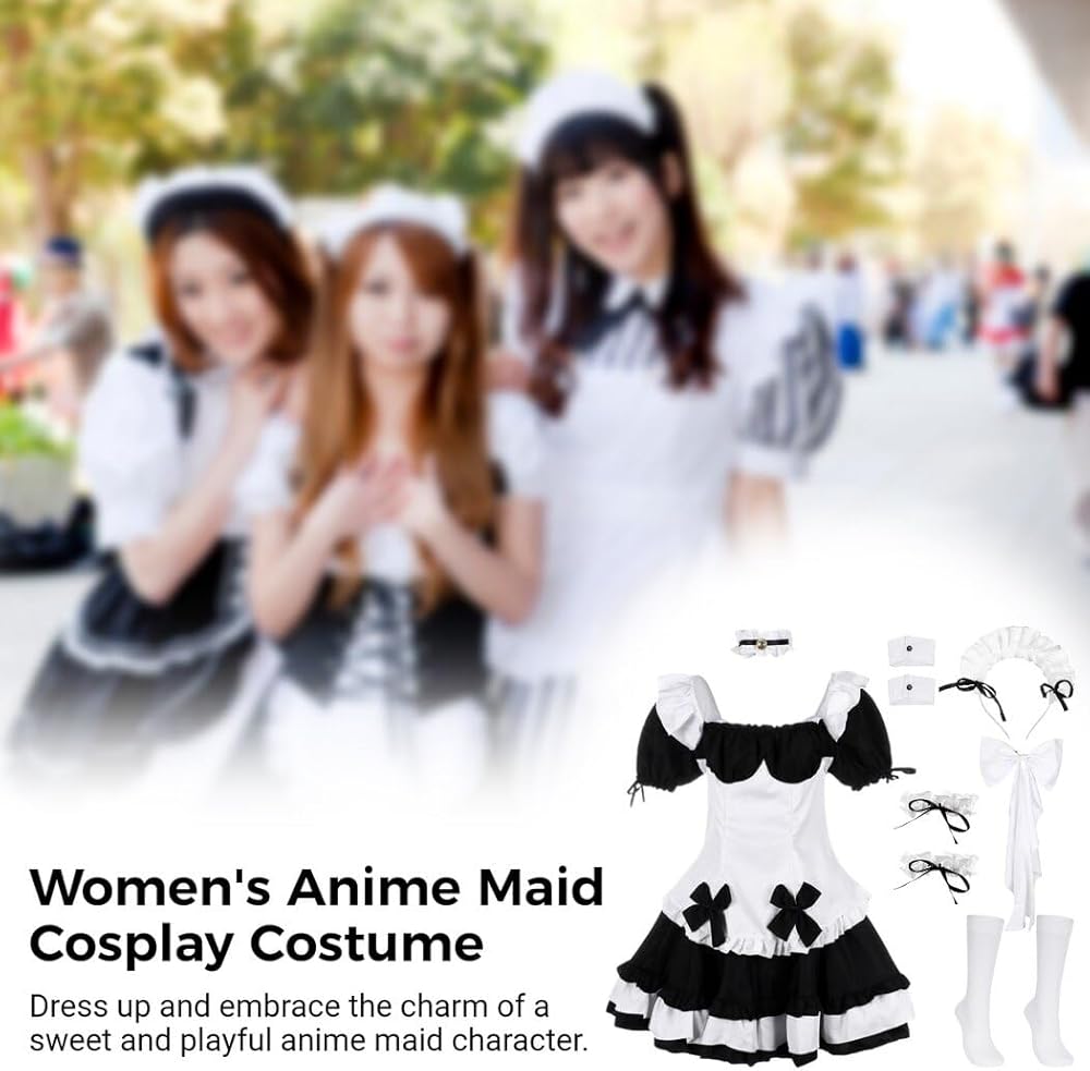 Package Includes: 1 * Blouse, 1 * Back Bow, 1 * Skirt, 1 * Headband, 1 * Choker, 2 * Wrist Cuff, 2 * Leg Cuff, 1 Pair of Stockings