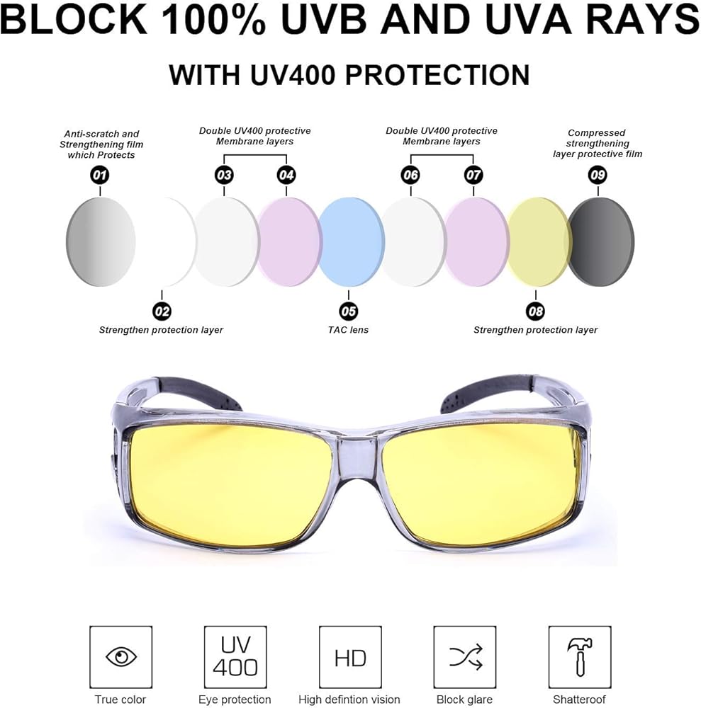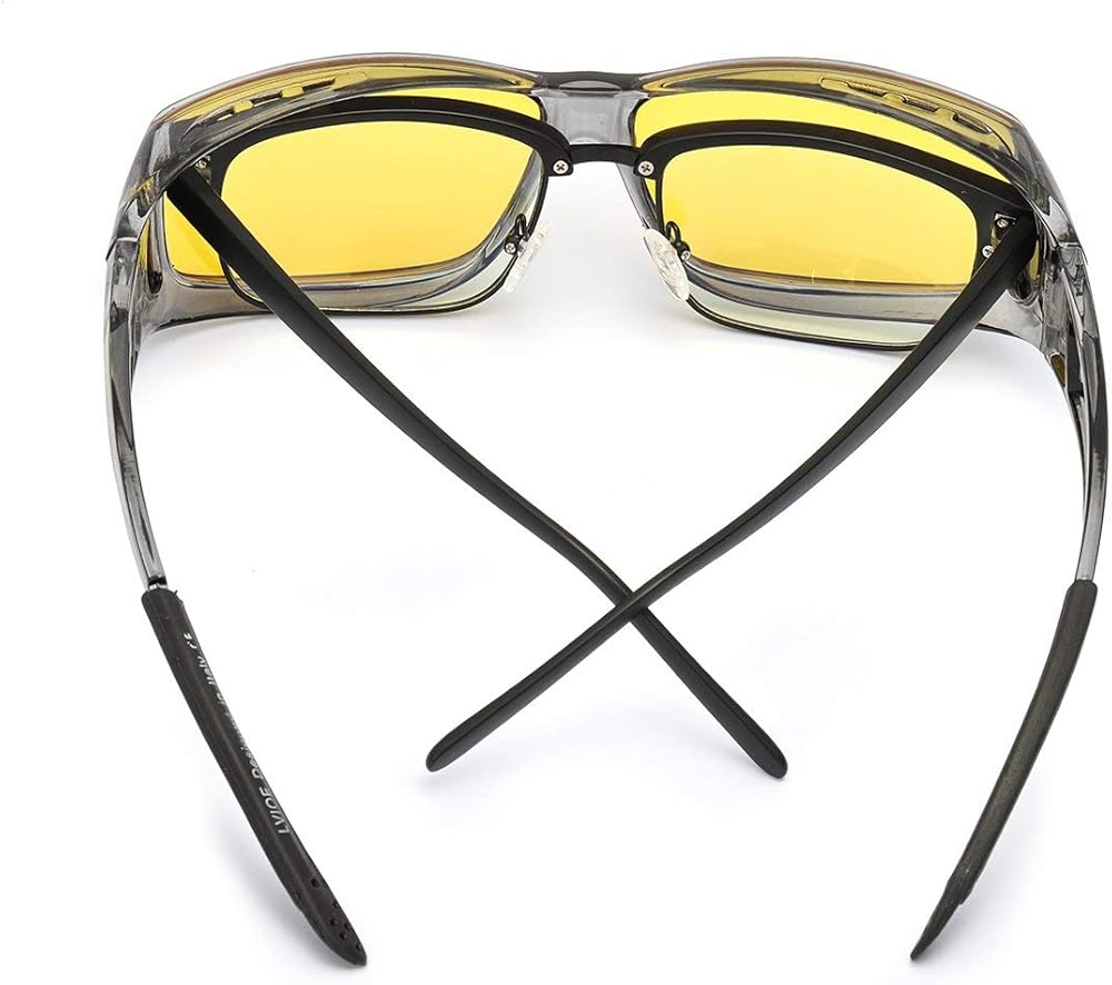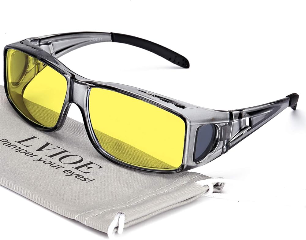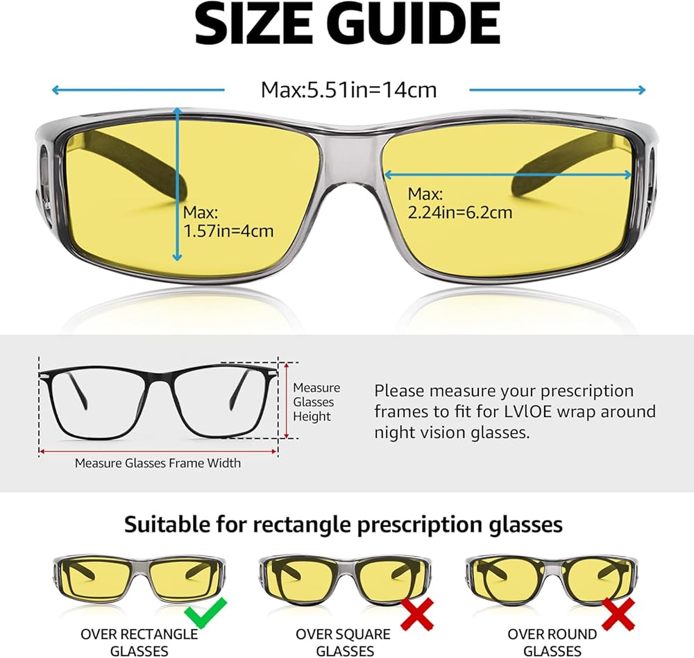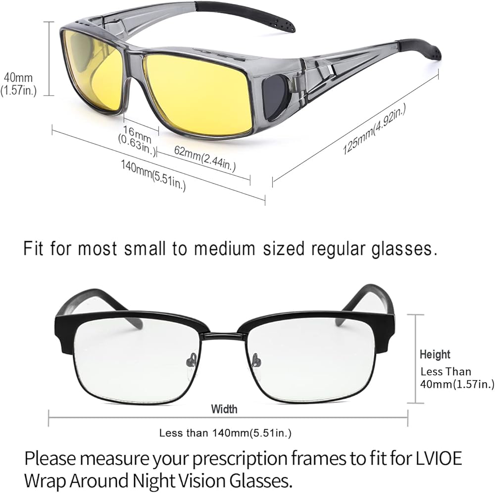 ►WRAP AROUND STYLE NIGHT-VISION GLASSES – LVIOE night-vision glasses excellent ergonomic design & lens for night-driving vision, it can improve the brightness when driving at night & on cloudy days, which is suitable for many situations. Meanwhile, it's specially designed for wearing over prescription eyewear. It can be easily fit over your regular glasses, such as RX Glasses/ Myopic Glasses/ Reading Glasses/ Presbyopic Glasses.