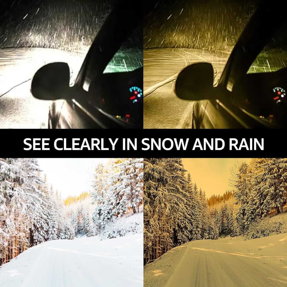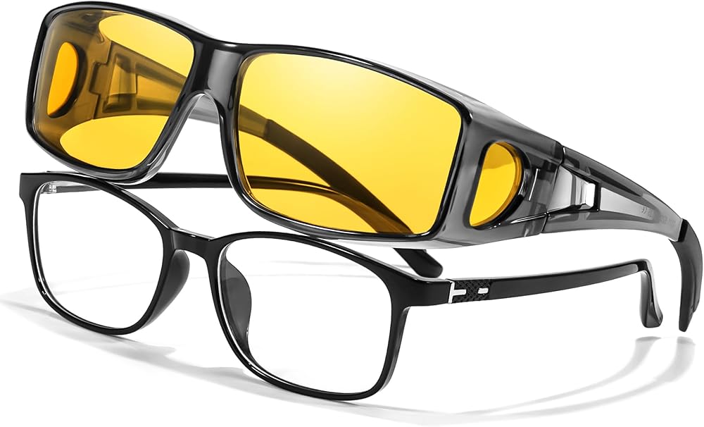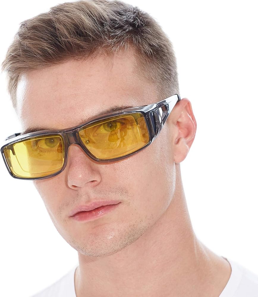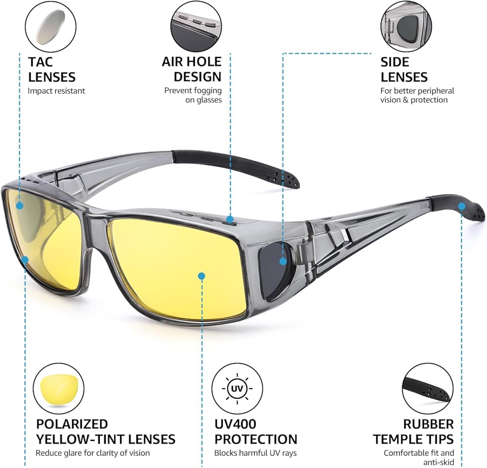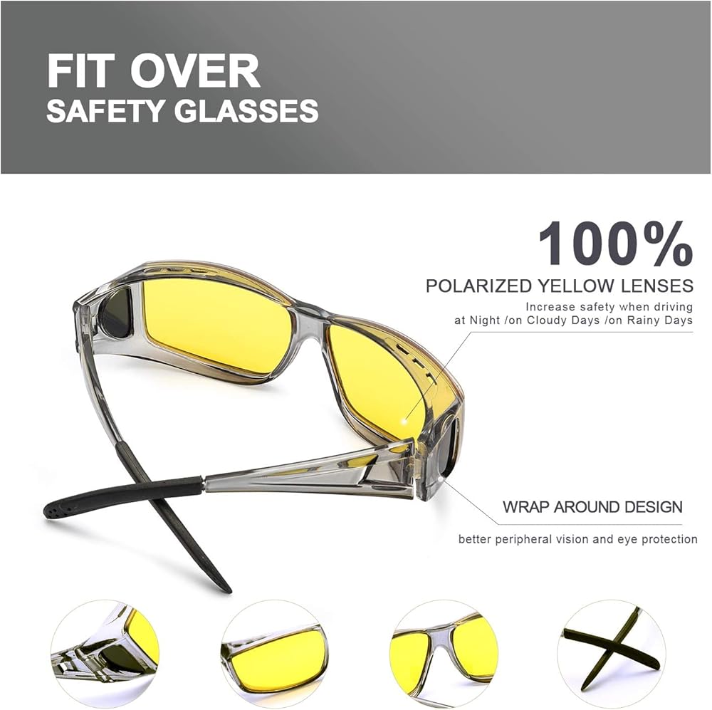 ►WRAP AROUND STYLE NIGHT-VISION GLASSES – LVIOE night-vision glasses excellent ergonomic design & lens for night-driving vision, it can improve the brightness when driving at night & on cloudy days, which is suitable for many situations. Meanwhile, it's specially designed for wearing over prescription eyewear. It can be easily fit over your regular glasses, such as RX Glasses/ Myopic Glasses/ Reading Glasses/ Presbyopic Glasses.