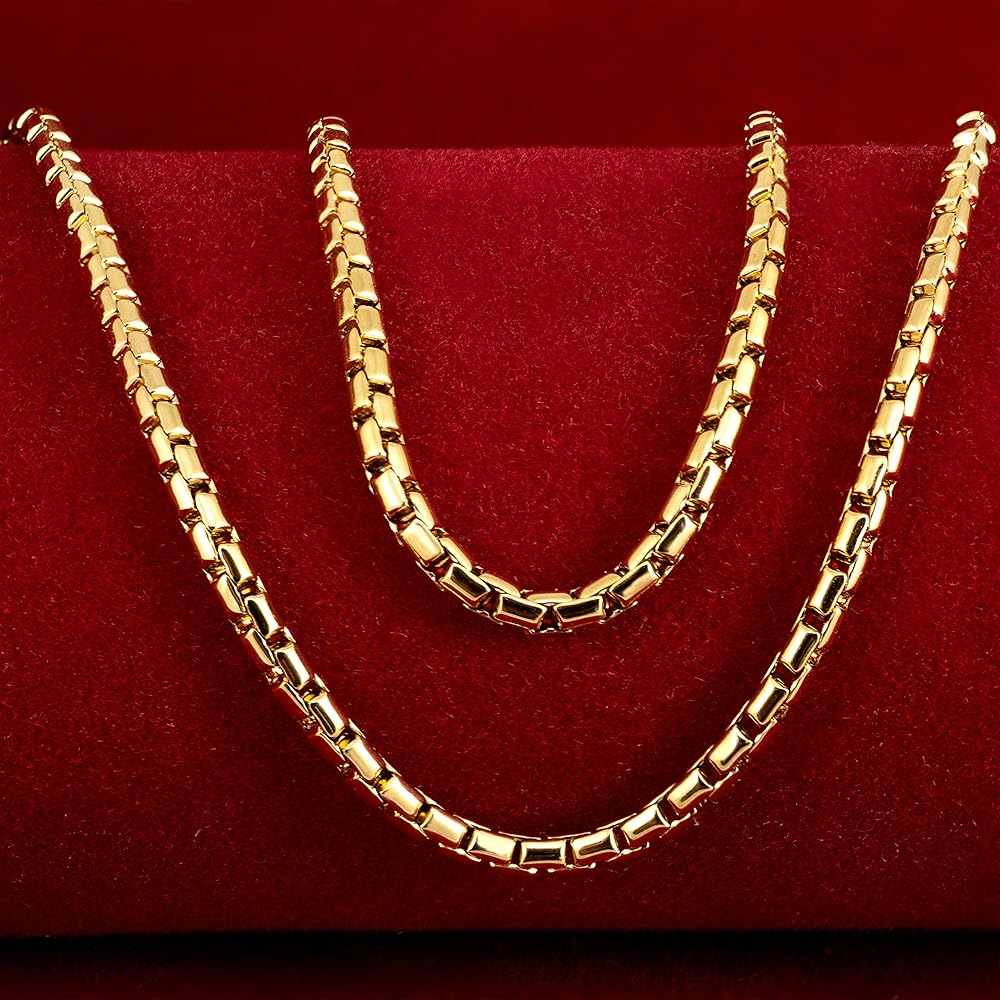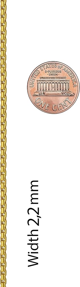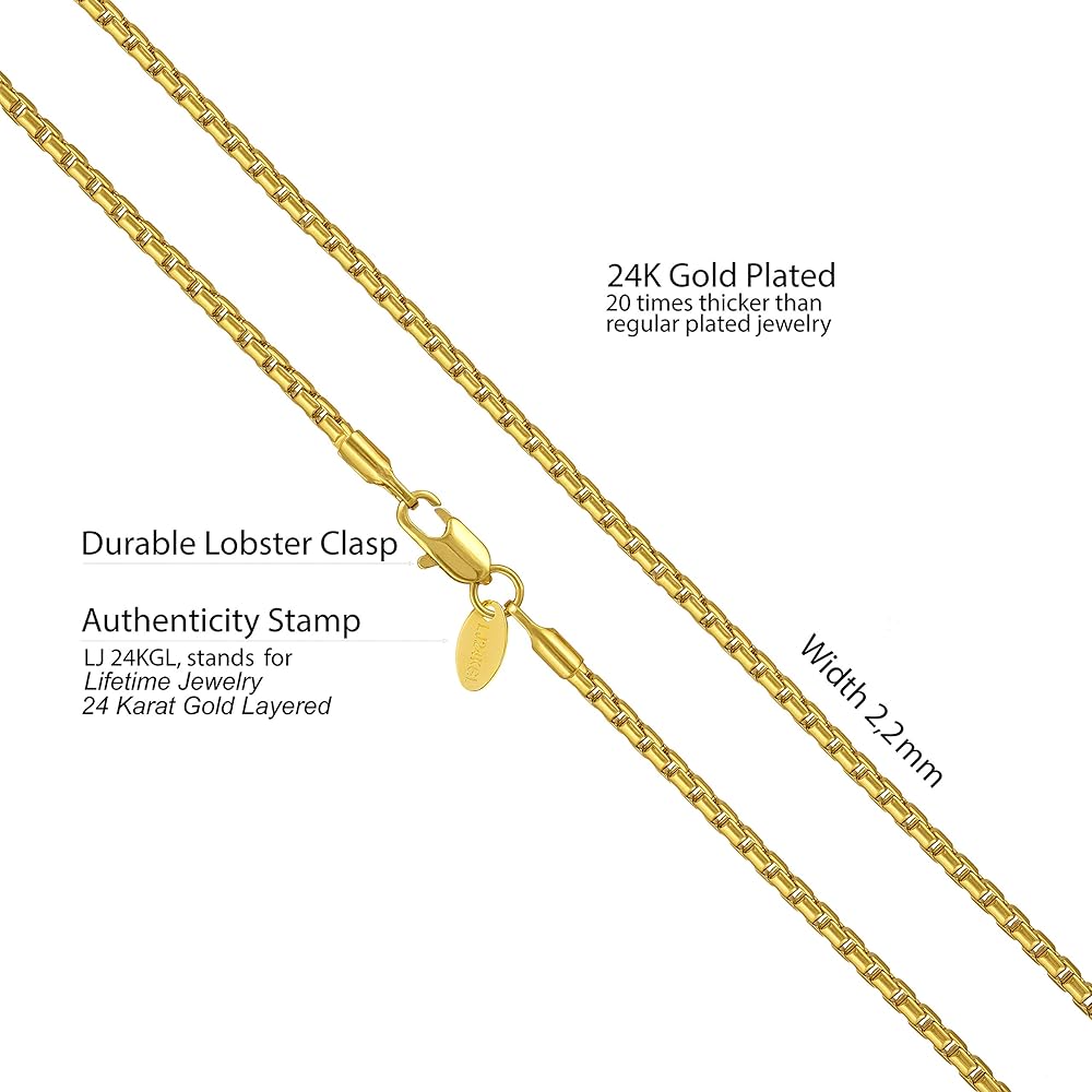 🔸 While other gold plated chains easily break, tarnish or turn your neck green; our necklaces for teen girls, women and men are MADE TO LAST; We use up to 20X more 24 karat gold plating than other electroplates; This gold box chain is 2.2mm (~ 0.09 inches) wide; Comes in 16 18 20 22 24 and 30 inches; Choice of Gold or White Gold (Rhodium)